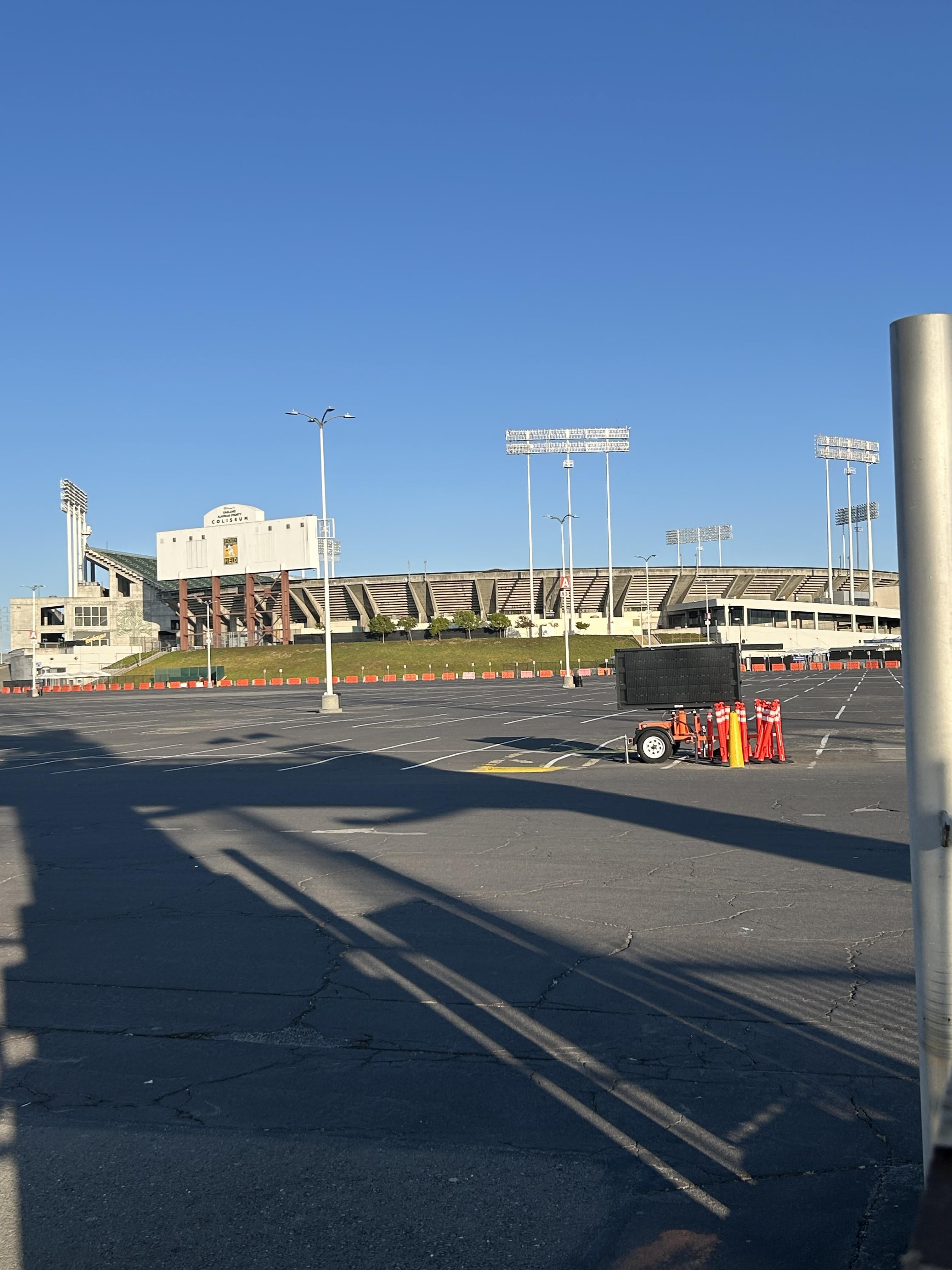 I was driving through Oakland for a Metallica show over the weekend and me and my dad decided to see the Coliseum. Now, I haven't seen it in person for an A's game but where I come from, we don't have major league stadiums so it seemed really big to me. I had seen the gate on the right hand side of the front gates that didn't seem locked, but of course it was and before going back to our car, this huge security guy comes out, looking like Deebo. He asked us if "we good?" and we said we was out of town-ers getting some pictures. He responded: "Okay, why were you over there?" when he pointed to the gate we were at. My dsd said we were finding a different angle for a picture.