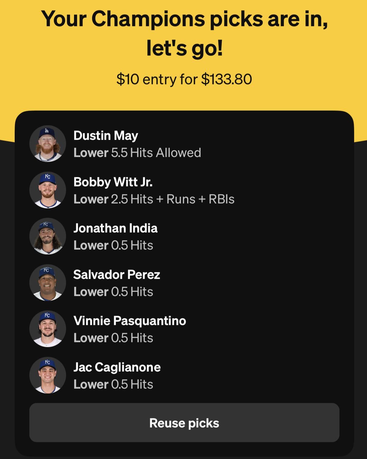 Now that I’m wagering my own money on the offense’s continued decline, this should help reverse it! That or this will be the first 6 leg parlay I win. Anyway, go Royals!