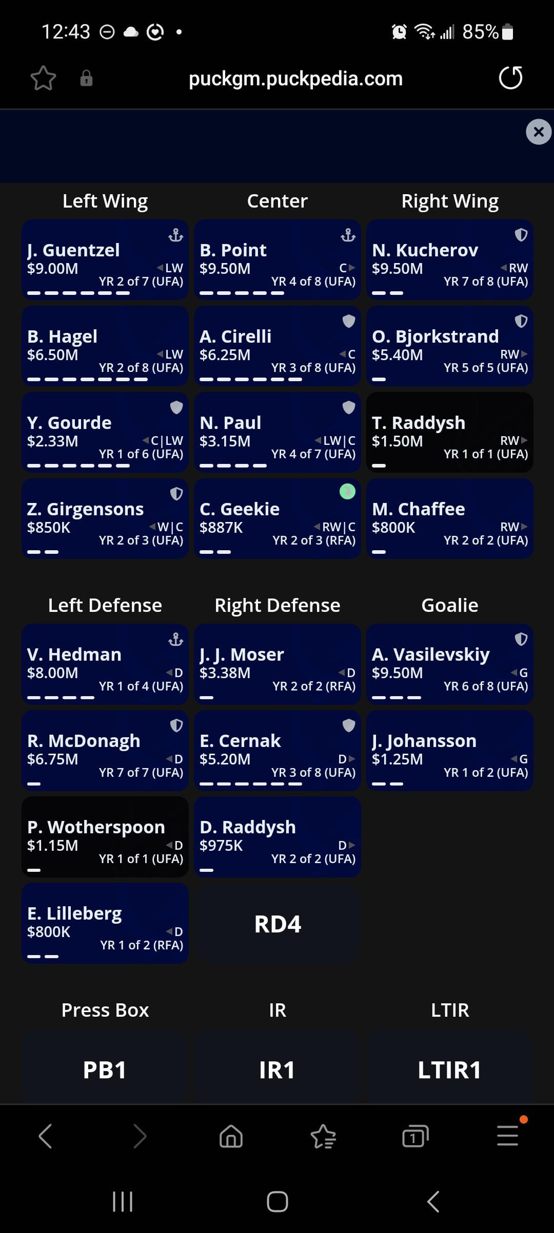 Forgot to include Gage, but there’s a few million in cap space to get him in there and move Chaffee to fwd 13.