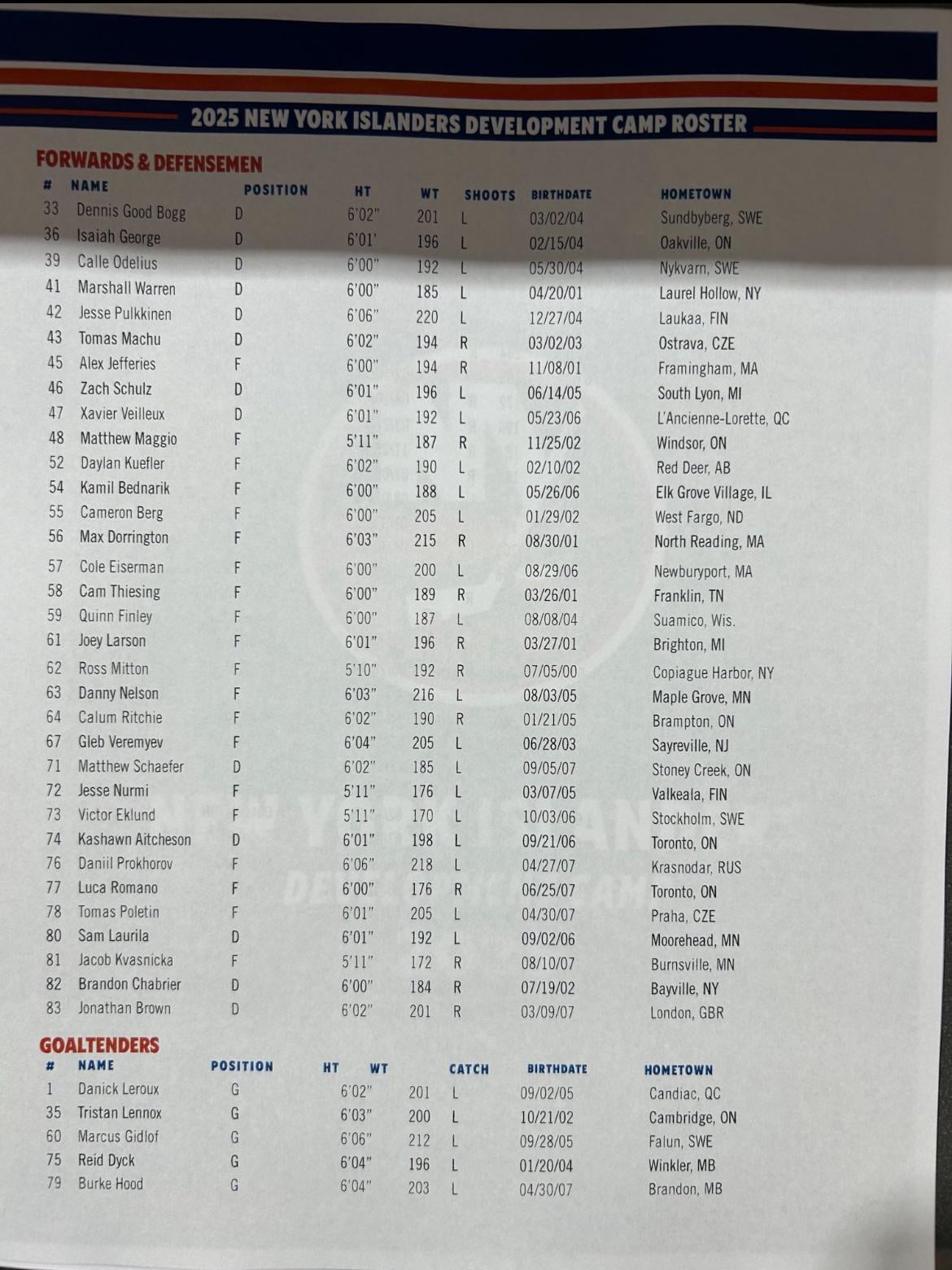 Development Camp Roster 8 comments Thanks for sharing this. Man we need to keep adding goalies! The Islanders are inviting the nephew of Sir Denis Eton-Hogg from Spinal Tap? Get Good Bogg on the team. I need that jersey Imagine what this list would have looked like after the 2023 draft? It feels good finally having some hope for this team. Did we have developmental camps and blue vs orange games during Lou’s tenure? Someone call Ray Romano from New York Newsday and see if he’s around to do a story on his nephew. Quinn Finley have a shot ? Pulkinnen vs Prokhorov …King Kong vs Godzilla. Leave a ReplyYou must be logged in to post a comment.