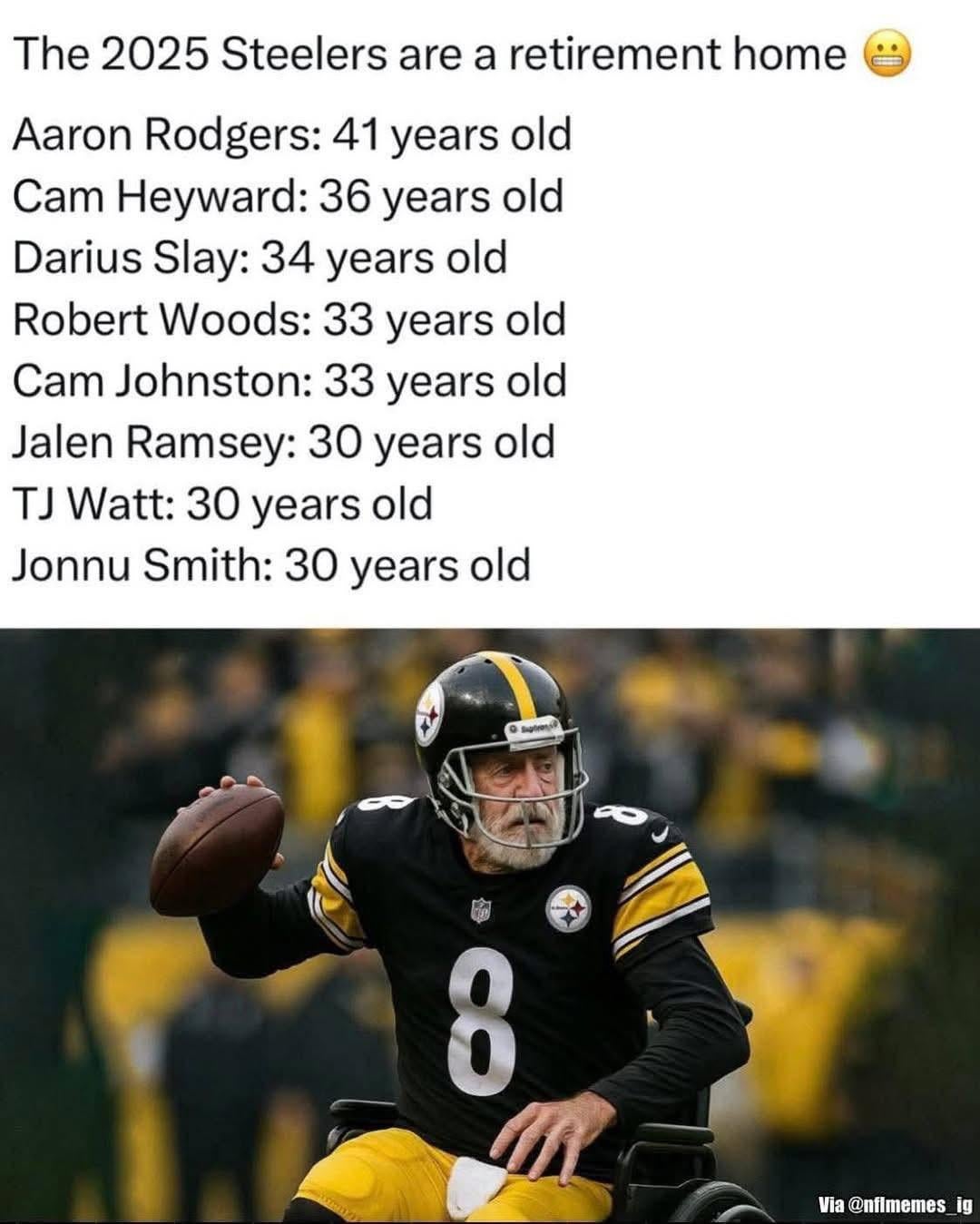 Rumor is naps are allowed during half time this season. 10 comments I can’t wait to see Aaron Rodgers play this year. I don’t think he will be any good, but I still wanna see it. TJ Watt is already 30? Damn 35 is the new 30 and 30 is the new 25 but 41 is still old as dirt At this point, the NFL should be legally required to have a large scary man from the Heyward family on a roster every year. Everyone but AR is younger than me. Also, Cam has been 36 for the last 20 years. Jonny smith is 30 😳😬. Damn I’m old. Robert Woods being that old makes me sad. He was awesome in college Saying “Retirement home @ 30” is Devilishly Crazy🫤 8-9 is gonna never have looked so wrinkly Forgot all about Slay. More impressed with Heyward tho. Being in the trenches that long has gotta be tough. Leave a ReplyYou must be logged in to post a comment.