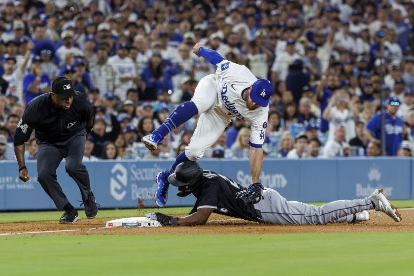 Dodger Max Muncy grimaces as he holds his left knee after colliding with White Sox outfielder Michael A. Taylor on Wednesday at Dodger Stadium. (Gina Ferazzi/Los Angeles Times)
