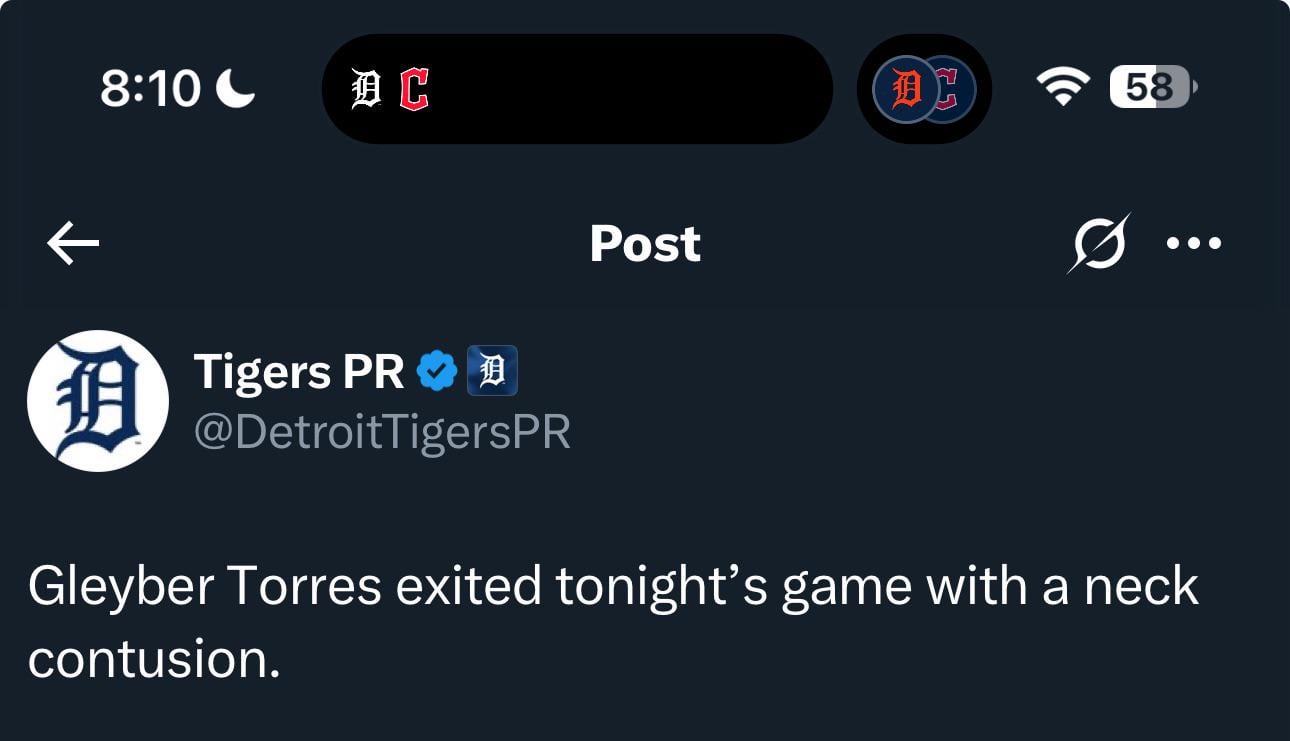 [Tigers PR] Gleyber Torres exited tonight’s game with a neck contusion