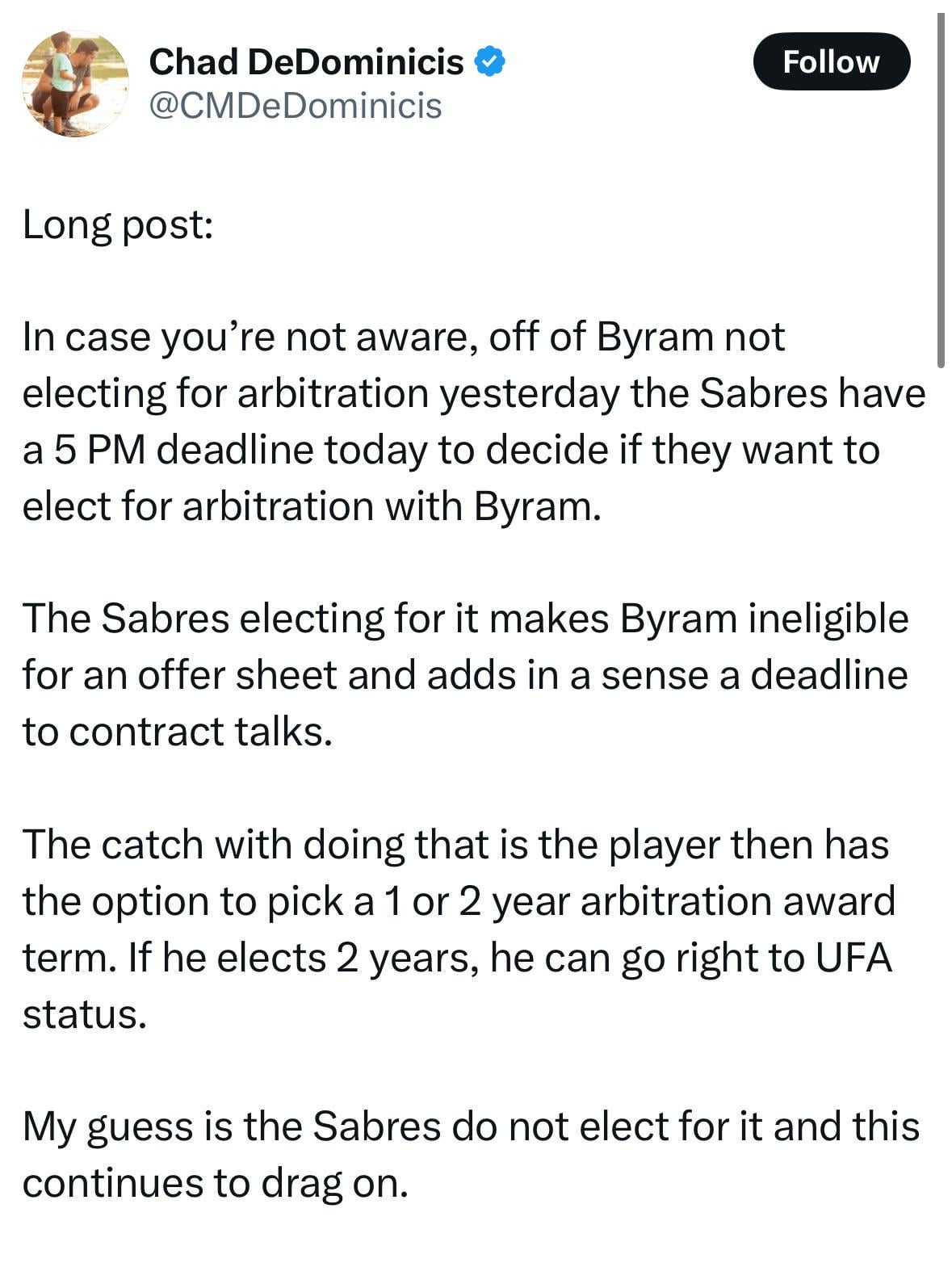 [DeDominicis] In case you’re not aware, off of Byram not electing for arbitration yesterday the Sabres have a 5 PM deadline today to decide if they want to elect for arbitration with Byram.