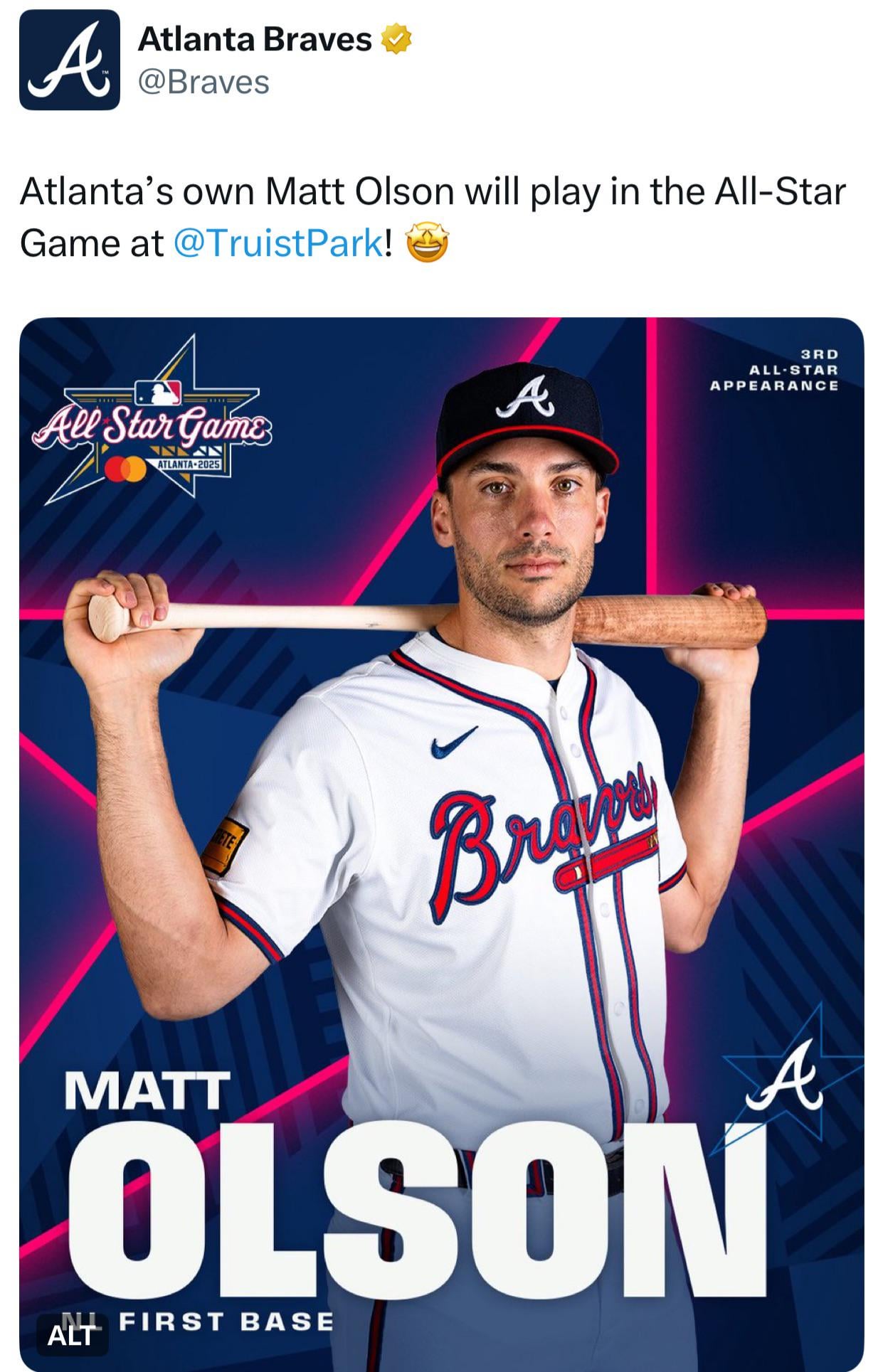 [Braves] Atlanta’s own Matt Olson will play in the All-Star Game at Truist Park! 24 comments Deserved. Was really hoping he’d be one of the reserves. https://preview.redd.it/hec73j1nnbbf1.jpeg?width=965&format=pjpg&auto=webp&s=de972ee7061ac337545fb12cd6237841dc6bd457 Nice, well deserved. Hopefully that will be it for the Braves. No one else should be there imo. Completely deserved. My boy!! Well deserved Well deserved. Coaches appreciate him more than the fanbase (who is still salty about Freddie). Raisel will be there too. He’ll be lobbing the balls for the HR derby. https://preview.redd.it/vw0y97fqobbf1.jpeg?width=640&format=pjpg&auto=webp&s=1aaa094dd204219006e823a947a4139ce3dd548f Well deserved!! ONCE AGAIN REQUESTING THE ARTHUR MEME https://preview.redd.it/25q0cdrfqbbf1.png?width=1980&format=png&auto=webp&s=f7c6ead6d4db08a9503ec56bb6046967084d6a7a Not much to be happy about this season. But he really deserves it and I was worried he might be snubbed. Roñald has the star power, but Matty O has quietly been our best player this year. Fight me. Well, getting to see Matt all dressed up for the ASG red carpet will certainly make up for having Max be there for the AL’s squad, I guess! 👏 He deserves it as does Riley. Two of the best corner men in the league. Edit: Not that Riley made the team. He has turned it on. 👏 Okay when did I miss the stupid bitch thing and what is it 😂 Awesome i never doubted him The irony of Freddy and Matt both playing in Atlanta for the same team Matty O! They had to pick someone I want Matt in the home run derby Leave a ReplyYou must be logged in to post a comment.