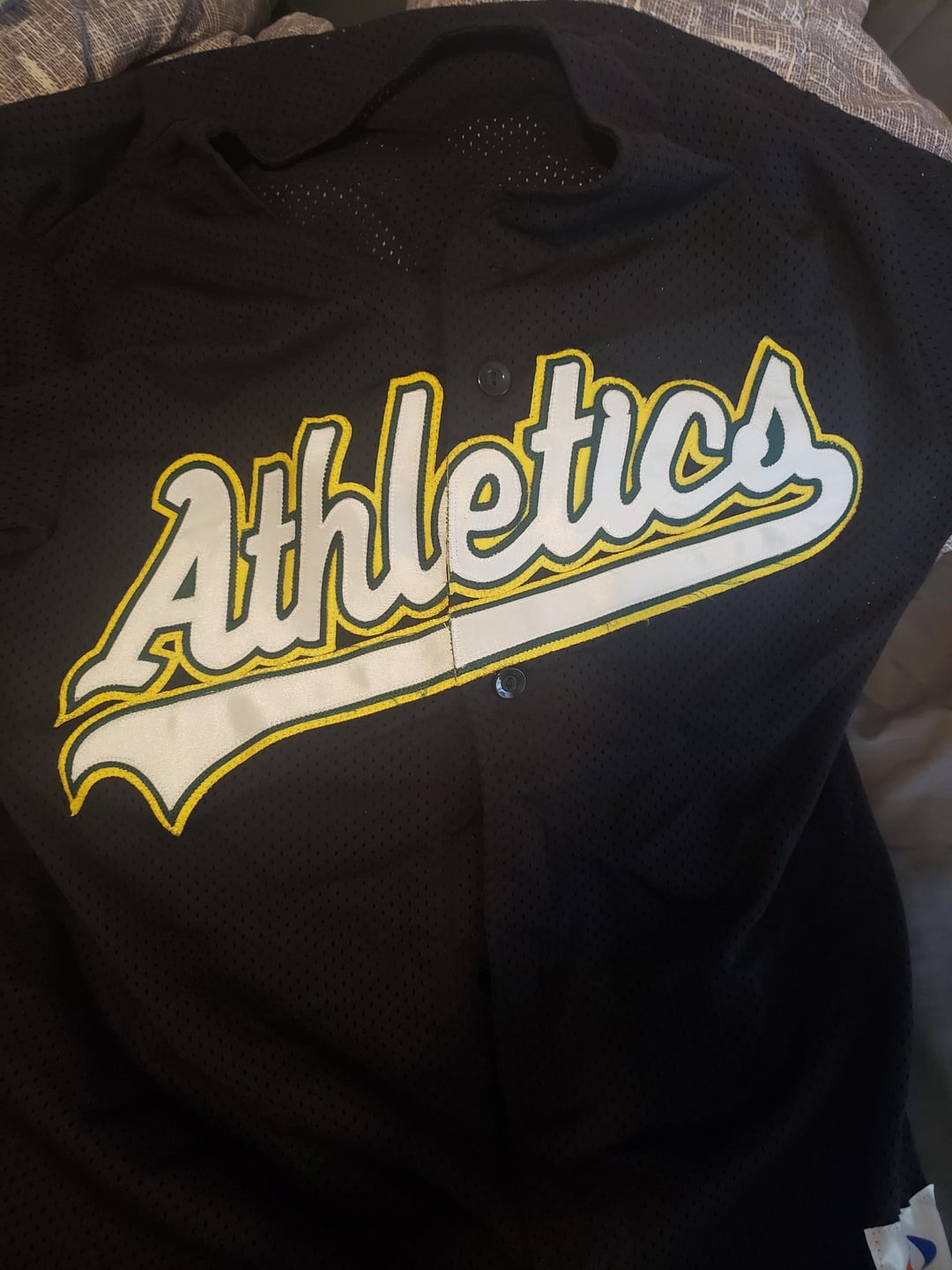 No such thing as a black alt practice jersey. This knockoff even forgot the extra tail on the “A” of Athletics. The”H” and “L” in Athletics both are supposed to have a loop (not a straight line) at the top, the font is too fat, the dot on the “I” isn’t isolated, etc. So many issues.