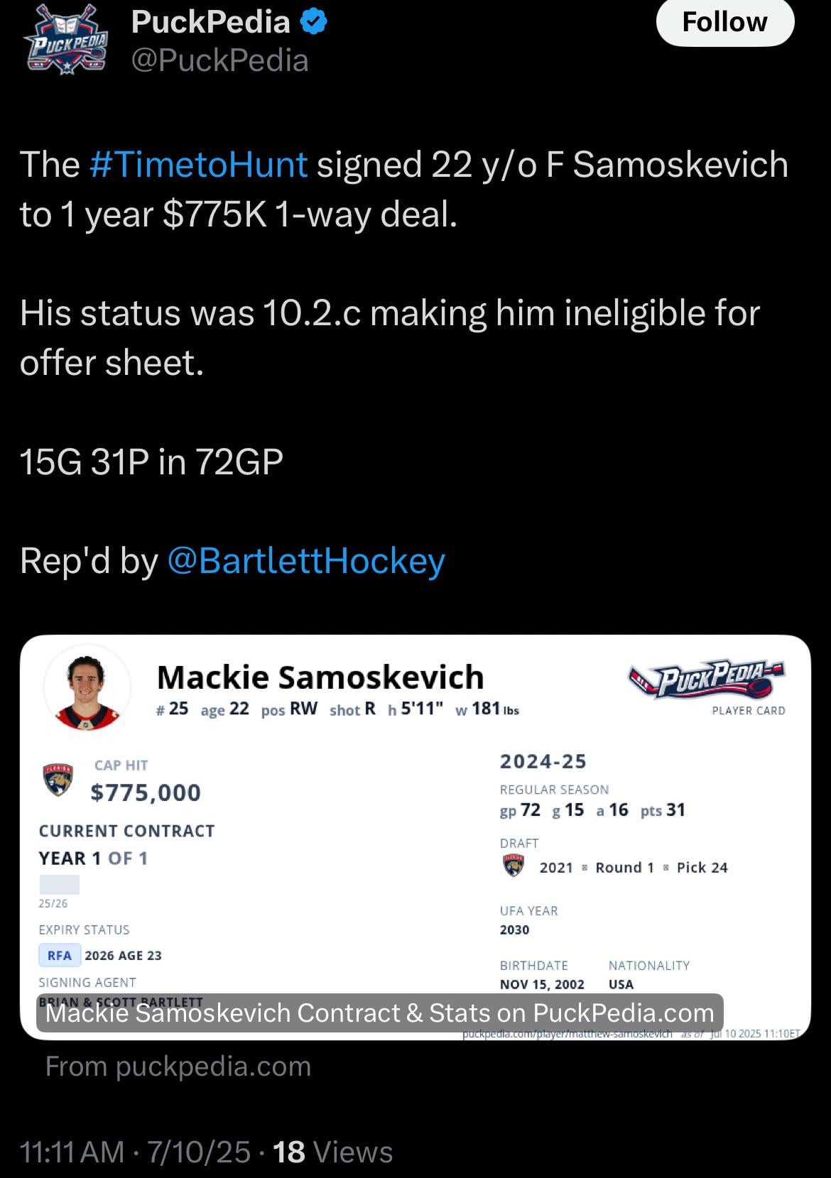 [PuckPedia] The Florida Panthers signed 22 y/o F Samoskevich to 1 year $775K 1-way deal. His status was 10.2.c making him ineligible for offer sheet. Leave a ReplyYou must be logged in to post a comment.