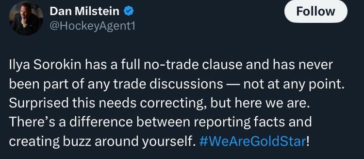 [Dan Milstein] Ilya Sorokin has a full no-trade clause and has never been part of any trade discussions — not at any point. Surprised this needs correcting, but here we are. There’s a difference between reporting facts and creating buzz around yourself.