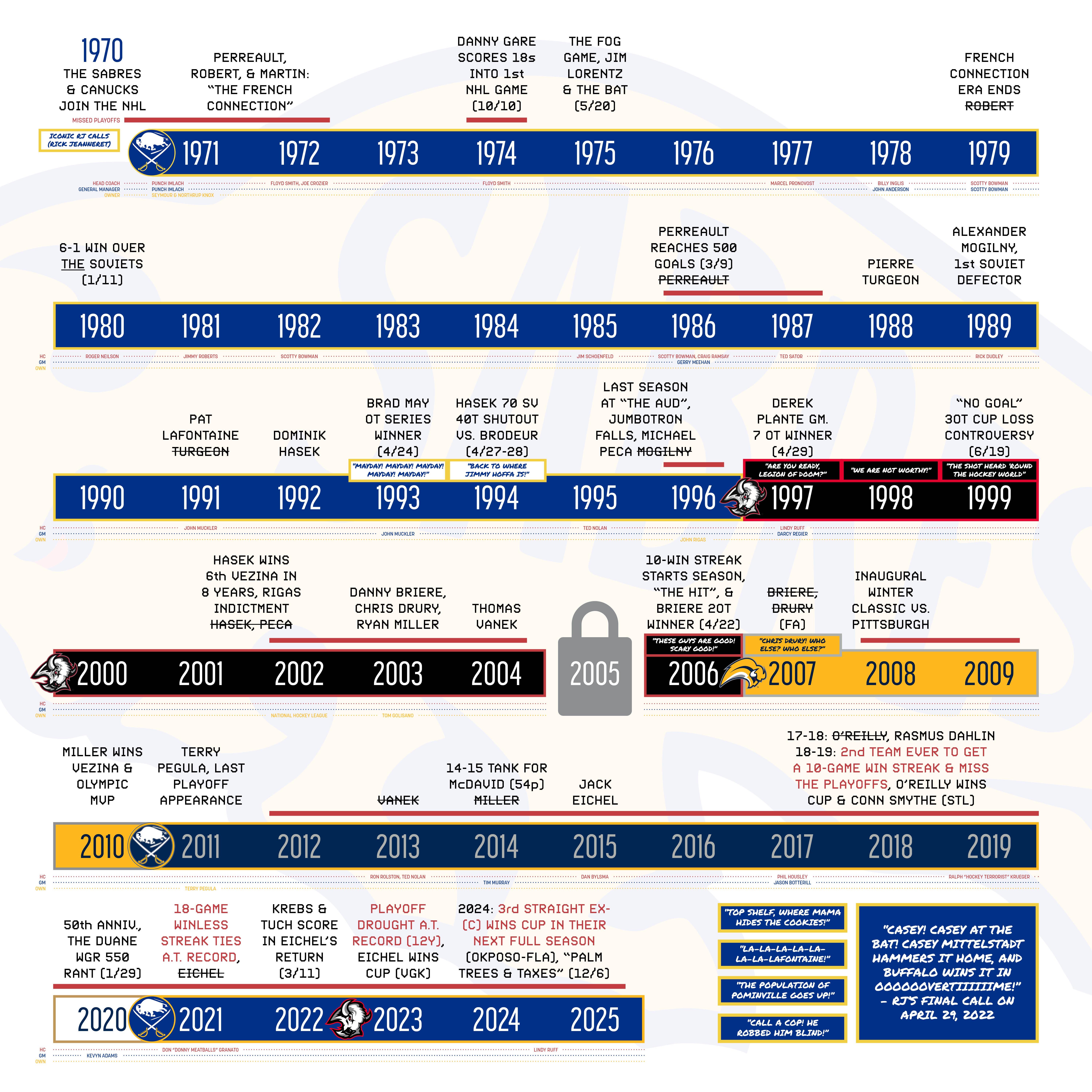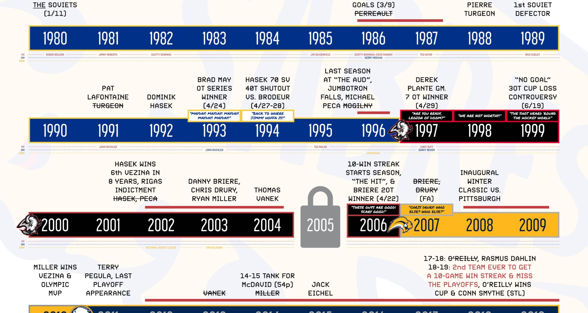 I'd love some help with corrections or recommendations for notable things to add, or even for things to remove if they're out of place or too insignificant to be on here. I'm not local to Buffalo, so I couldn't start following the team closely until around 2006 when technology & my budget allowed me to do so remotely. As such, anything pre-2006 was filled out here as best as I could with the help of online research.