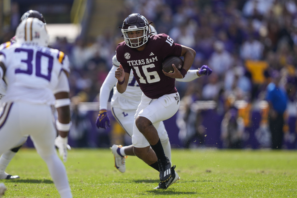 Texas A&M quarterback Jaylen Henderson (16) carries in the first half of an NCAA college football game against LSU in Baton Rouge, La., Saturday, Nov. 25, 2023. (AP Photo/Gerald Herbert)