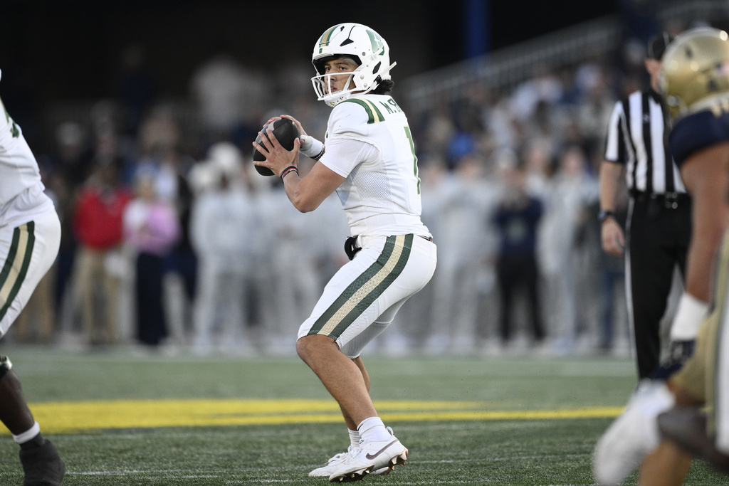 Charlotte quarterback Max Brown (1) in action during the second half of an NCAA college football game against Navy, Saturday, Oct. 19, 2024, in Annapolis, Md. (AP Photo/Nick Wass)