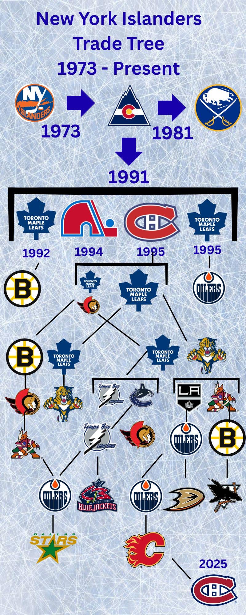 Last month’s Noah Dobson trade extended an NHL trade tree that has been going since 1973. As far as I can tell, this is one of the longest existing trade trees in the league. For the full list of trades and players involved, you can check out the link below.