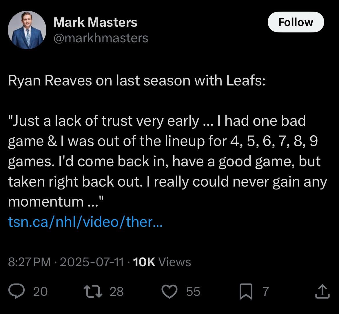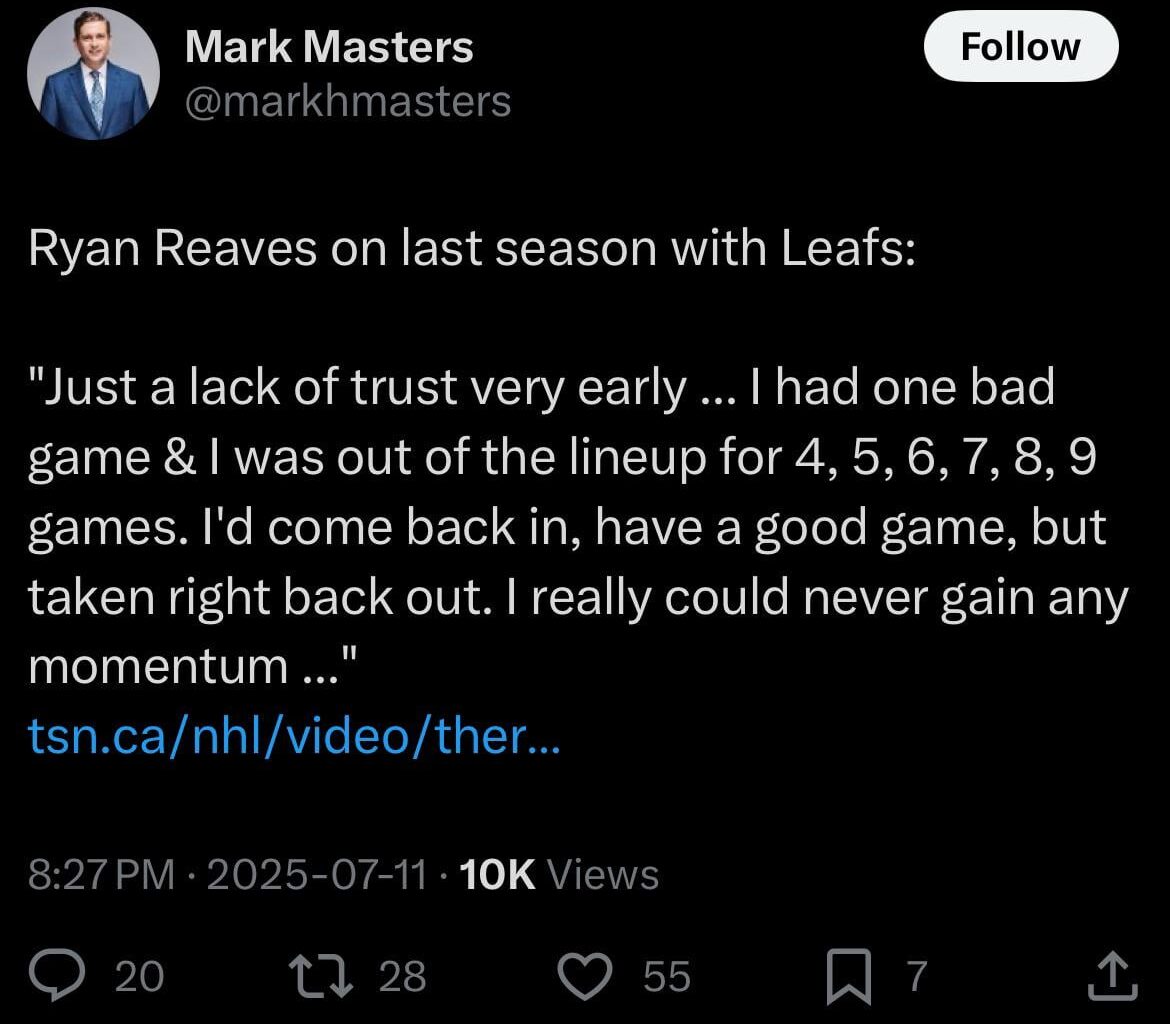 [Masters] Ryan Reaves on last season with Leafs: “Just a lack of trust very early … I had one bad game & was out of the lineup for 4, 5, 6, 7, 8, 9 games. I’d come back in, have a good game, but taken right back out. I really could never gain any momentum …”