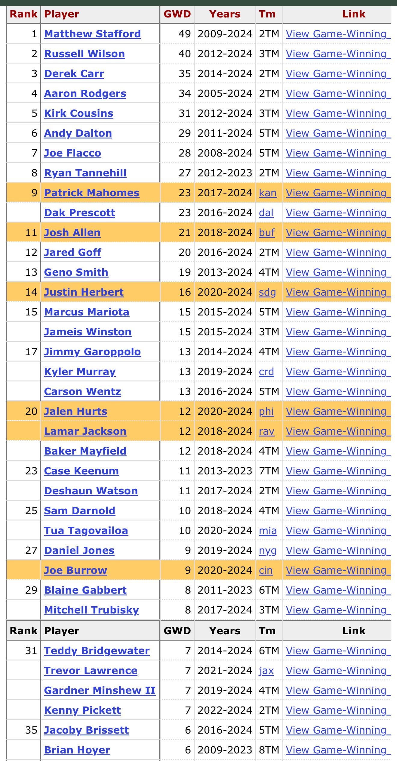 Matthew Stafford is first because he’s played most of his career on losing teams and you have to be losing in the first place to score a game winning drive. Like Mahomes at 23 sounds a little low- (he got probably half of them this past season)