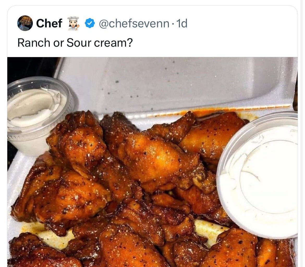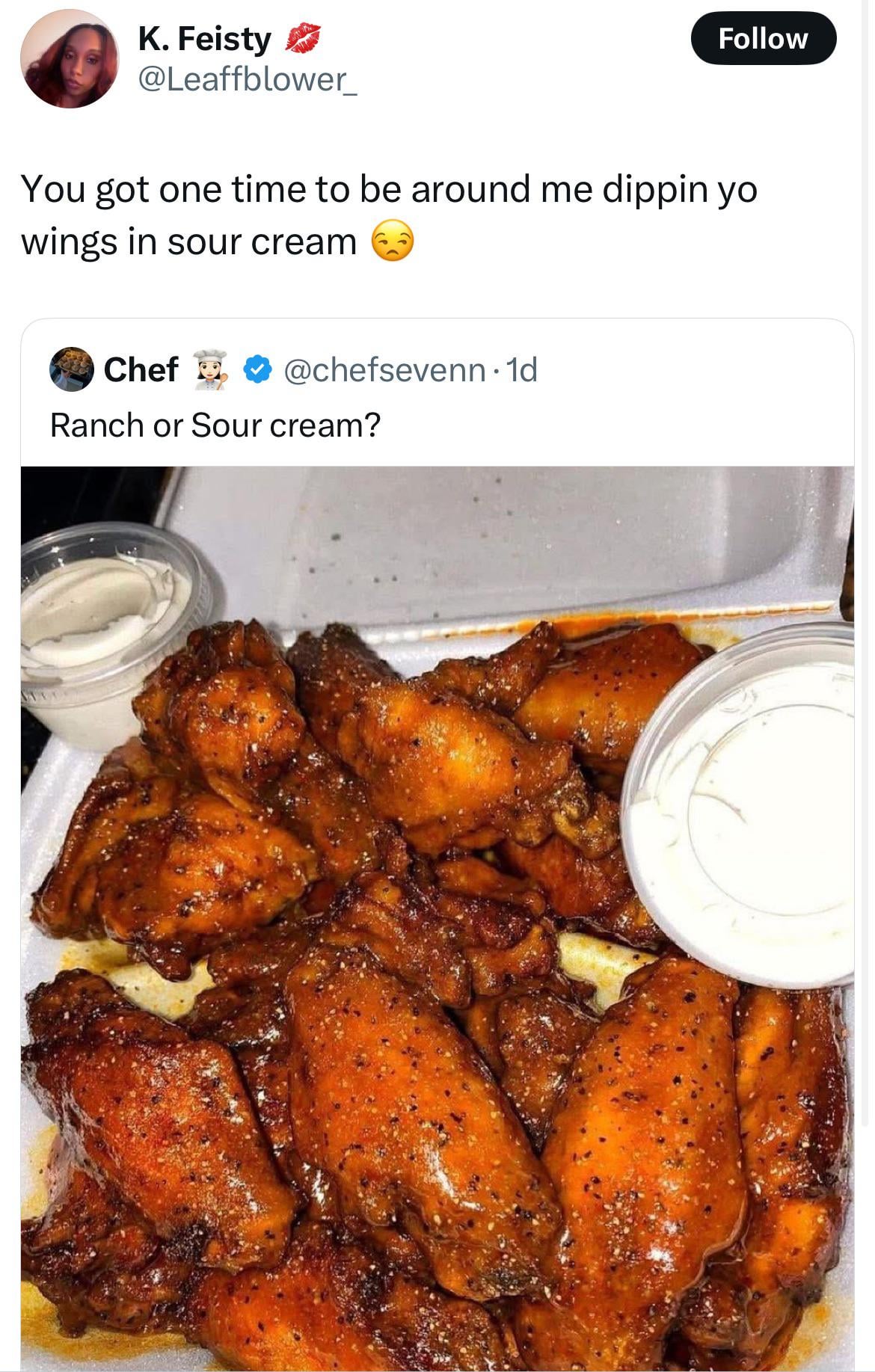 Ranch is already a crime in itself but if I catch you dipping wings in sour cream I’m kicking you in the balls
