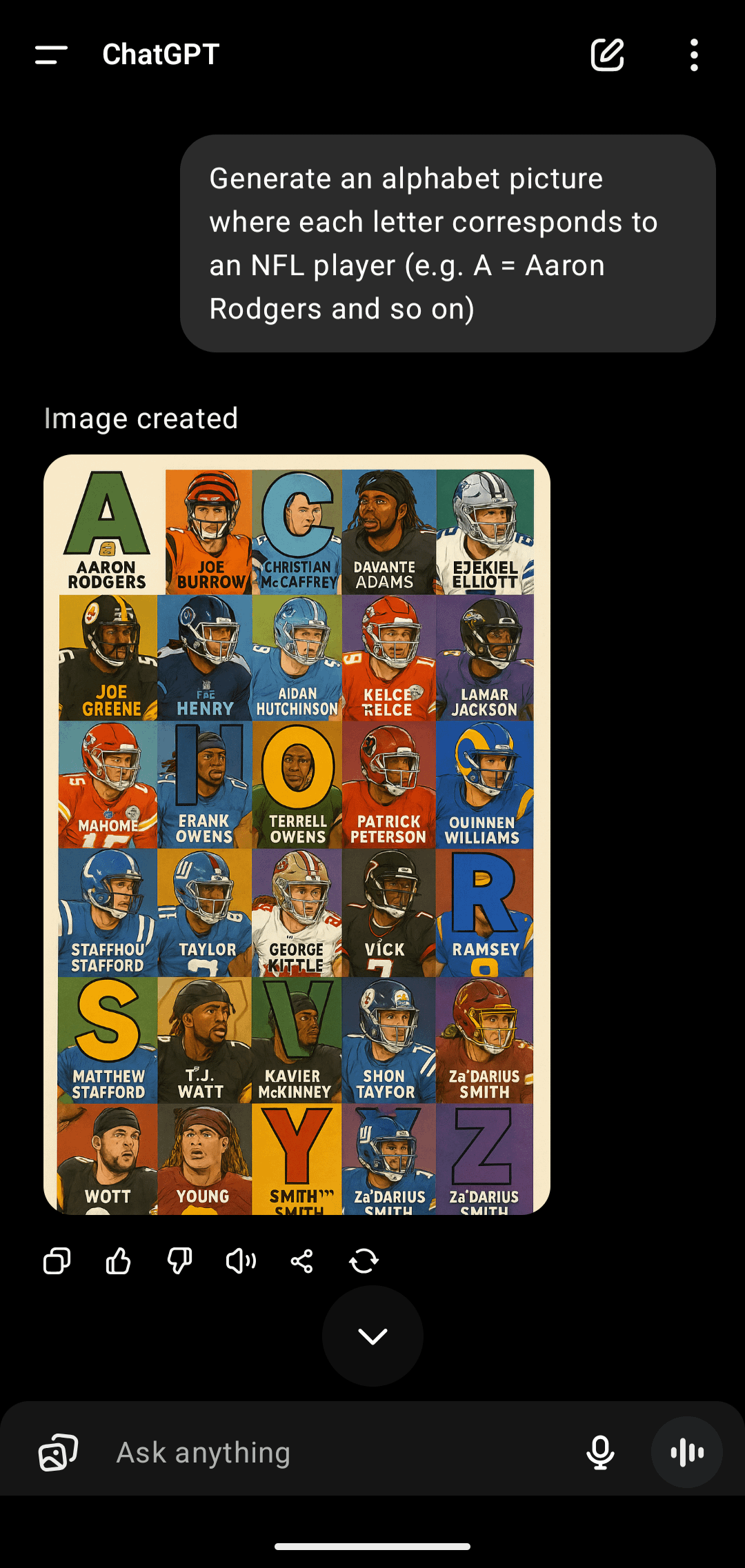 Corresponding to an NFL player doesn’t necessarily mean corresponding to an NFL player based on the letter matching the first letter of their name, and the example just means to use Aaron Rodgers for A, which it did, not necessarily because of the A itself.