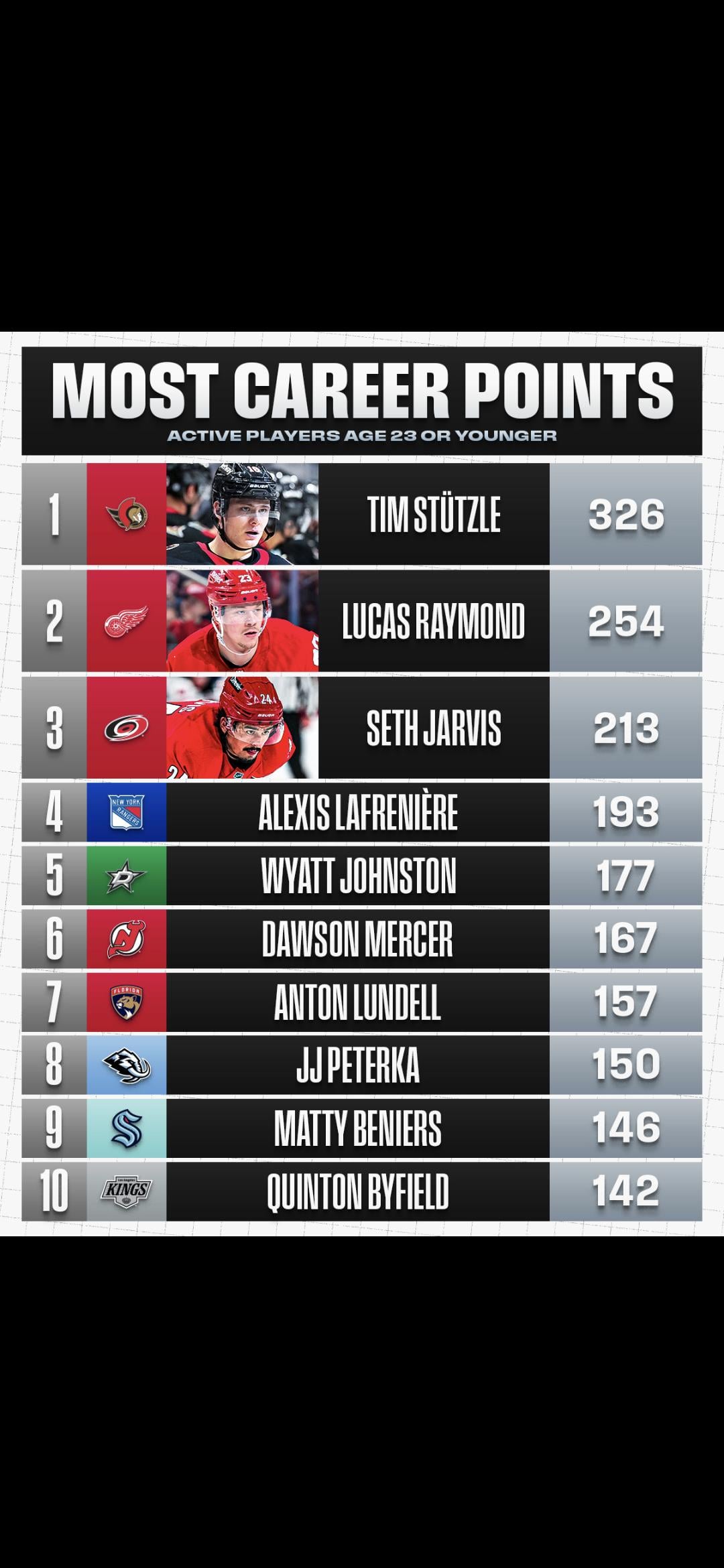 Johnston, Beniers, and Byfield are 22, the rest are 23. There’s certainly a skill level here but with no players younger than that this also implies the more time someone has playing, the more points they are likely to have aggregated.