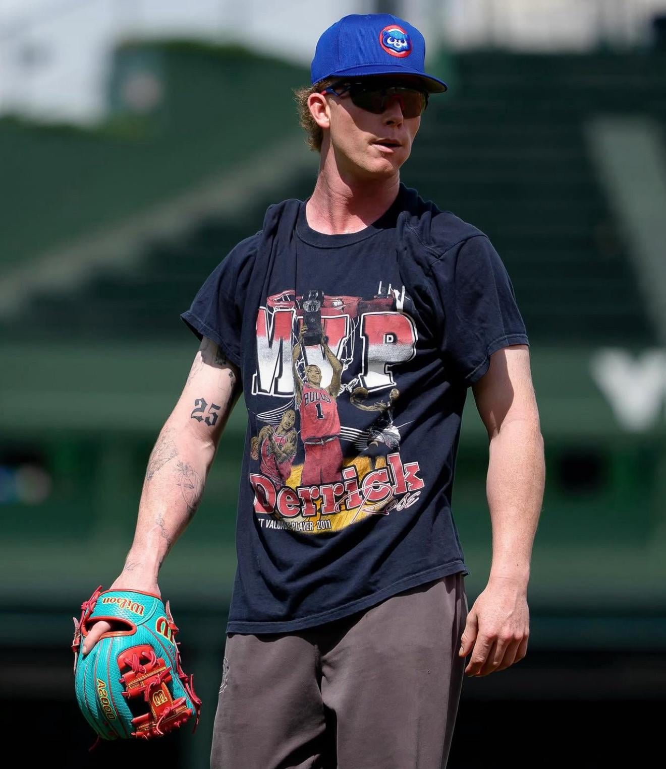 Cubs All-Star CF Pete Crow Armstrong rocking a Derrick Rose MVP T-Shirt as he warns up pre-game.