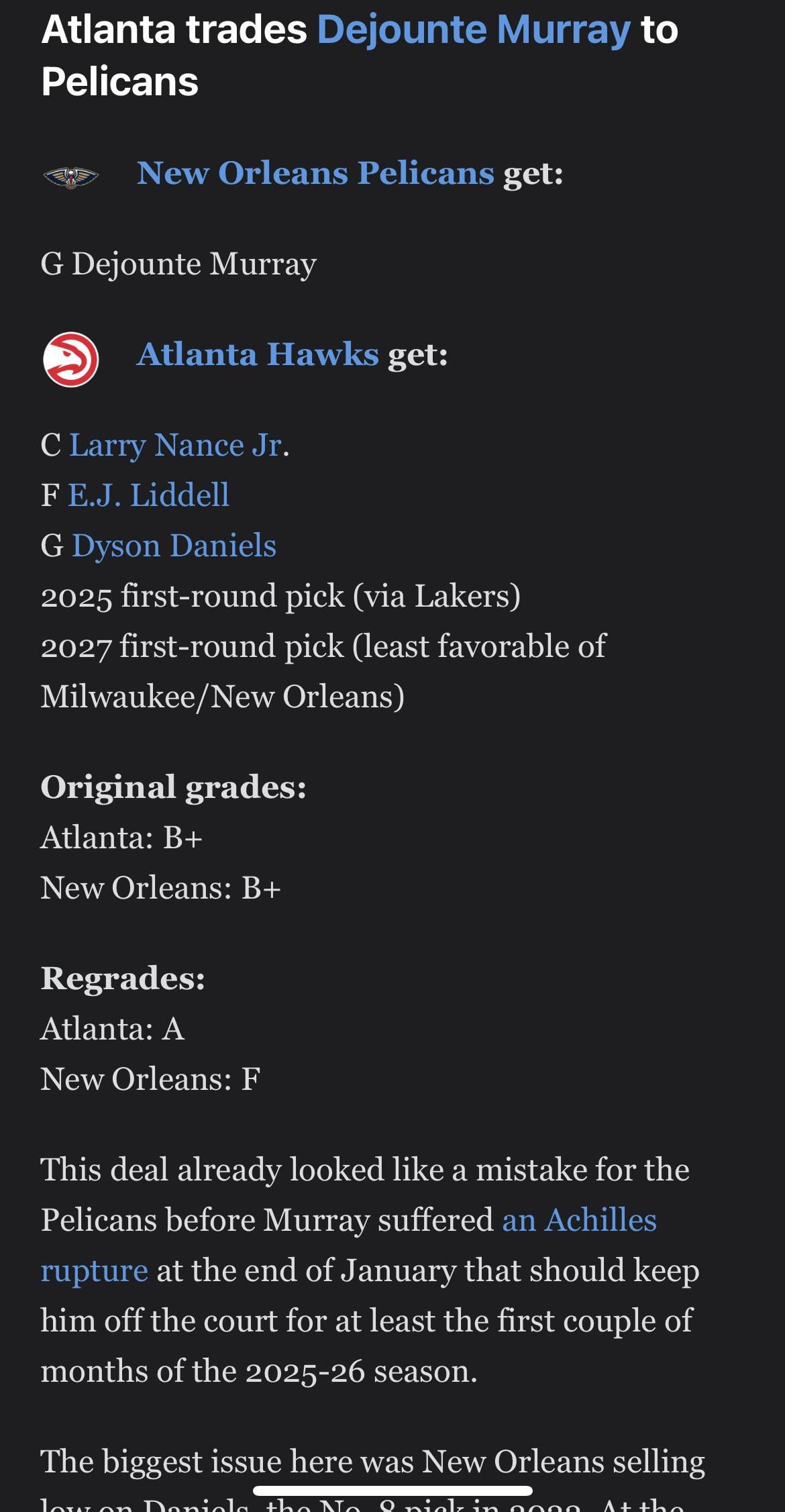 I went to like 10 games in Nola for the 2023-2024 season. Dyson had flashes of being good but you couldn’t have expected what he became in Atlanta with more minutes. Pelicans are cursed. But still if Dejounte doesn’t get hurt then this trade isn’t an F. Injuries are apart of the game and who is wasting time going back and regrading a trade since the main part of the trade tore his Achilles.