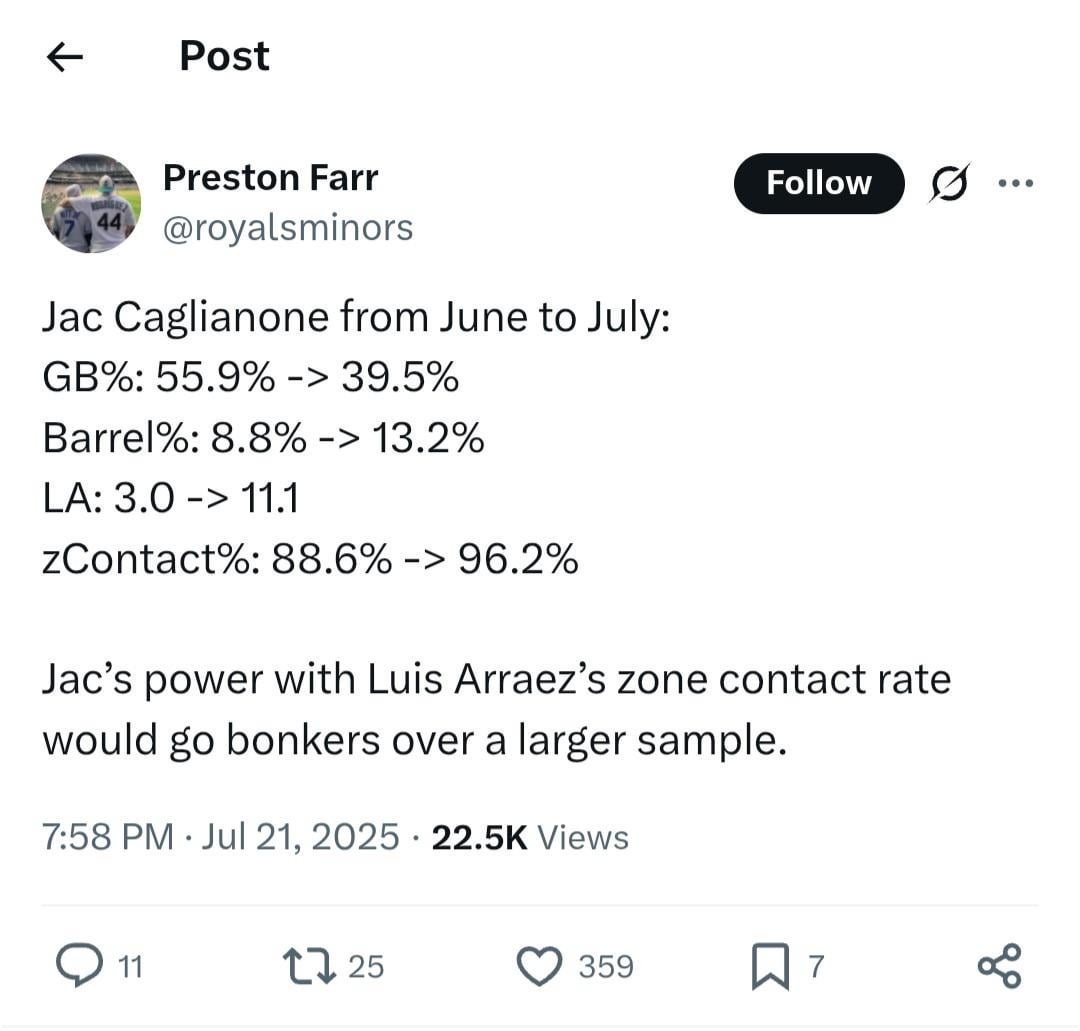 [Preston Farr] Jac Caglianone from June to July: GB%: 55.9% -> 39.5%, Barrel%: 8.8% -> 13.2%, LA: 3.0 -> 11.1, and zContact%: 88.6% -> 96.2%. Jac’s power with Luis Arraez’s zone contact rate would go bonkers over a larger sample.