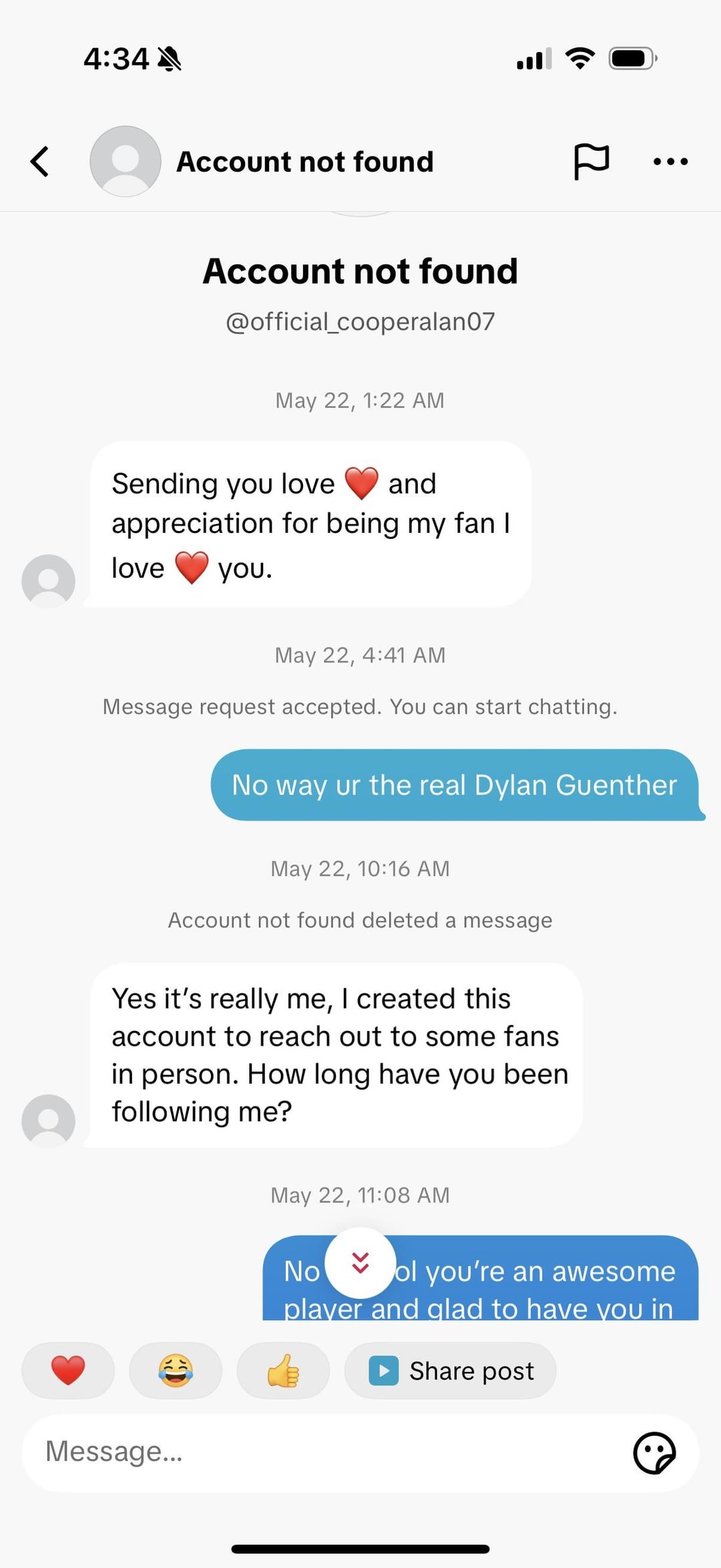 The weirdest thing ever I still have no explanation for it. some account named Dylan Gunther dmed me a couple months ago. This account wasn’t verified and I was positive it was a scam; I even fished for the scam… but it never came… now it’s gone. Is there some scam I’m missing here?