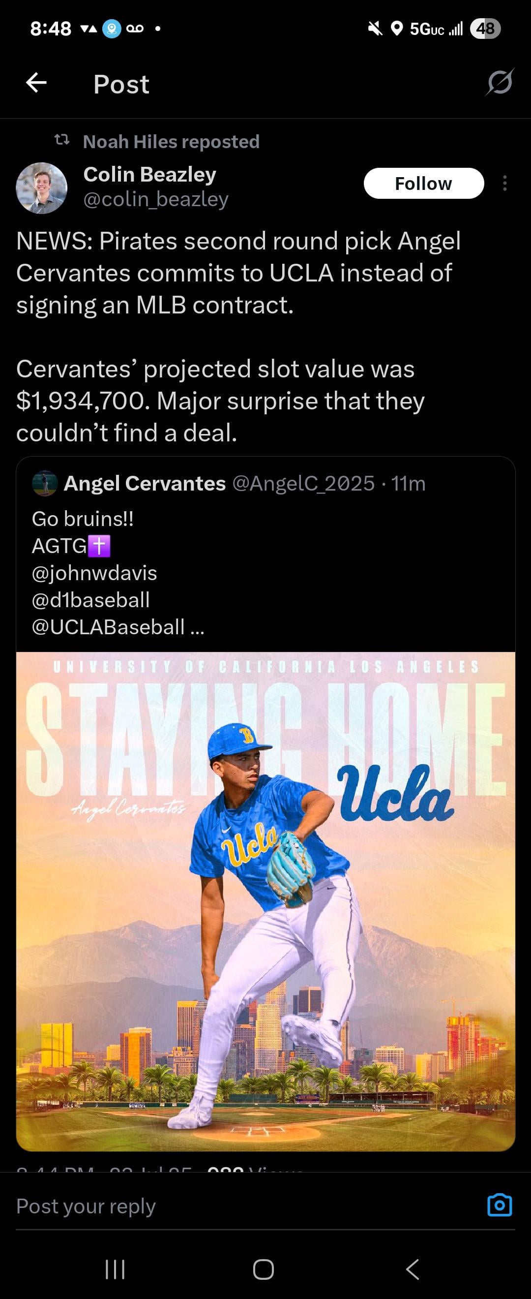 I read recently that these deals for the HS guys also generally include a guarantee that the team will fully cover 4 years of college if the guy doesn’t make it. Which UCLA will assuredly not do if he ends up unable to play for whatever reason.