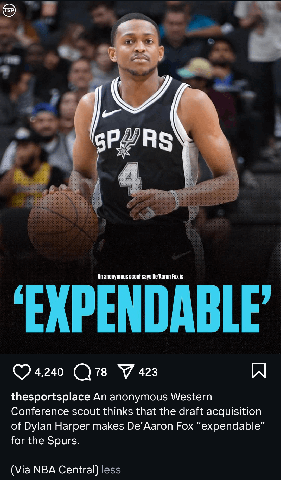 16. are they wrong though? three primary ball handling guards with questionable three point shots certainly leaves some concerns around future roster construction. the spurs traded for fox because they had the opportunity to get him for pennies. I don’t see why they should feel married to him indefinitely. i think he should stay short term because you need a vet to help get them back to the playoffs but long term I agree that hes expendable if harper and castle pan out.