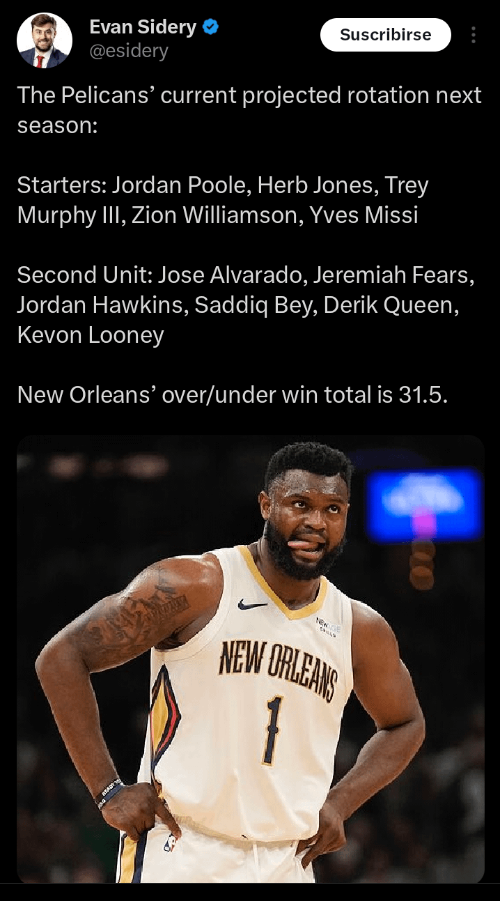 The Pelicans’ current projected rotation next season: 3 comments They better win more than that after trading the 26 pick. That bench is disgusting If Missi starts over Looney, they’re tanking. Which doesn’t make sense after you’ve traded away your first-round pick. But I’m not sure we can count on the the current Pelicans brain trust to understand that. Leave a ReplyYou must be logged in to post a comment.