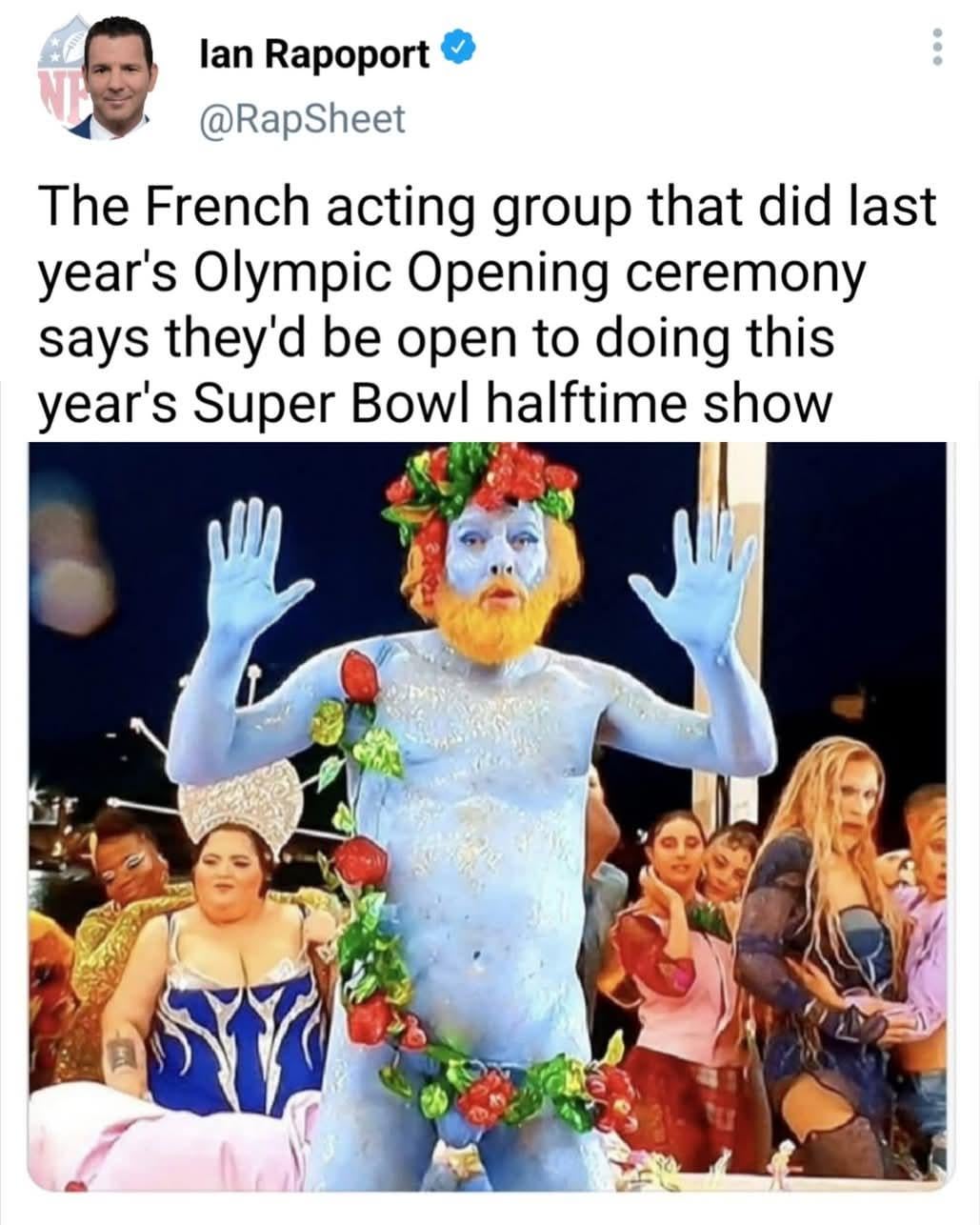 Gonna be lit! 25 comments I’d be for it just to see Republicans lose their minds. Maga meltdown incoming lol   I too am open to doing this year’s Super Bowl halftime show! Hell yeah  is that Gorlock the Destroyer? I AIN’T EVER GONNA STOP being weirded out by him Fuck that. Give me the mascots playing football vs the kid teams. Make them backup dancers for a conservative pandering country star to really make people’s heads explode. How many times has this same rage bait been posted? Just wondering Yo wtf is William Montgomery doing here lmao   Give me a collection of metal gods playing Black Sabbath and Ozzy songs! Most people are open to doing the Super Bowl halftime show These people couldn’t handle that kinda stage doing this shit hahahaha I’m here for it This was a fucking abomination for the love of everything no Romo is gunna bust a freaking nut “I will not be watching the Super Bowl this year.”  This man is Philippe Katerine and he’s a French national treasure. Hey, if they want to do the Gojira part of it thats something I could get behind. Please now, I dont want to have to argue with boomers about what is and isnt Art while watching football.  Leave a ReplyYou must be logged in to post a comment.