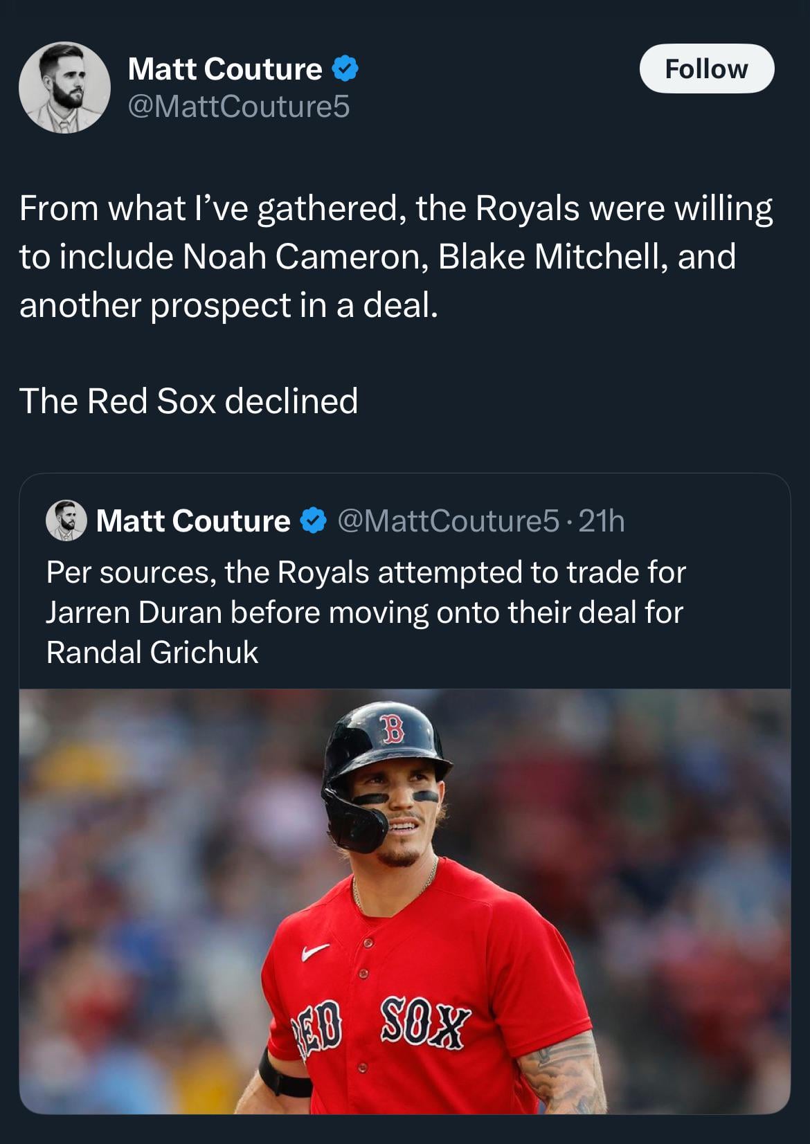 Royals apparently offered Noah Cameron, Blake Mitchell plus more for Jarren Duran. Boston, thankfully, declined.