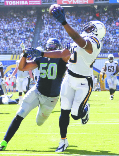 Chargers tight end Antonio Gates, right, hauls in a touchdown catch as Seattle Seahawks outside linebacker K.J. Wright defends on Sept. 14, 2014, in San Diego. (AP file photo)