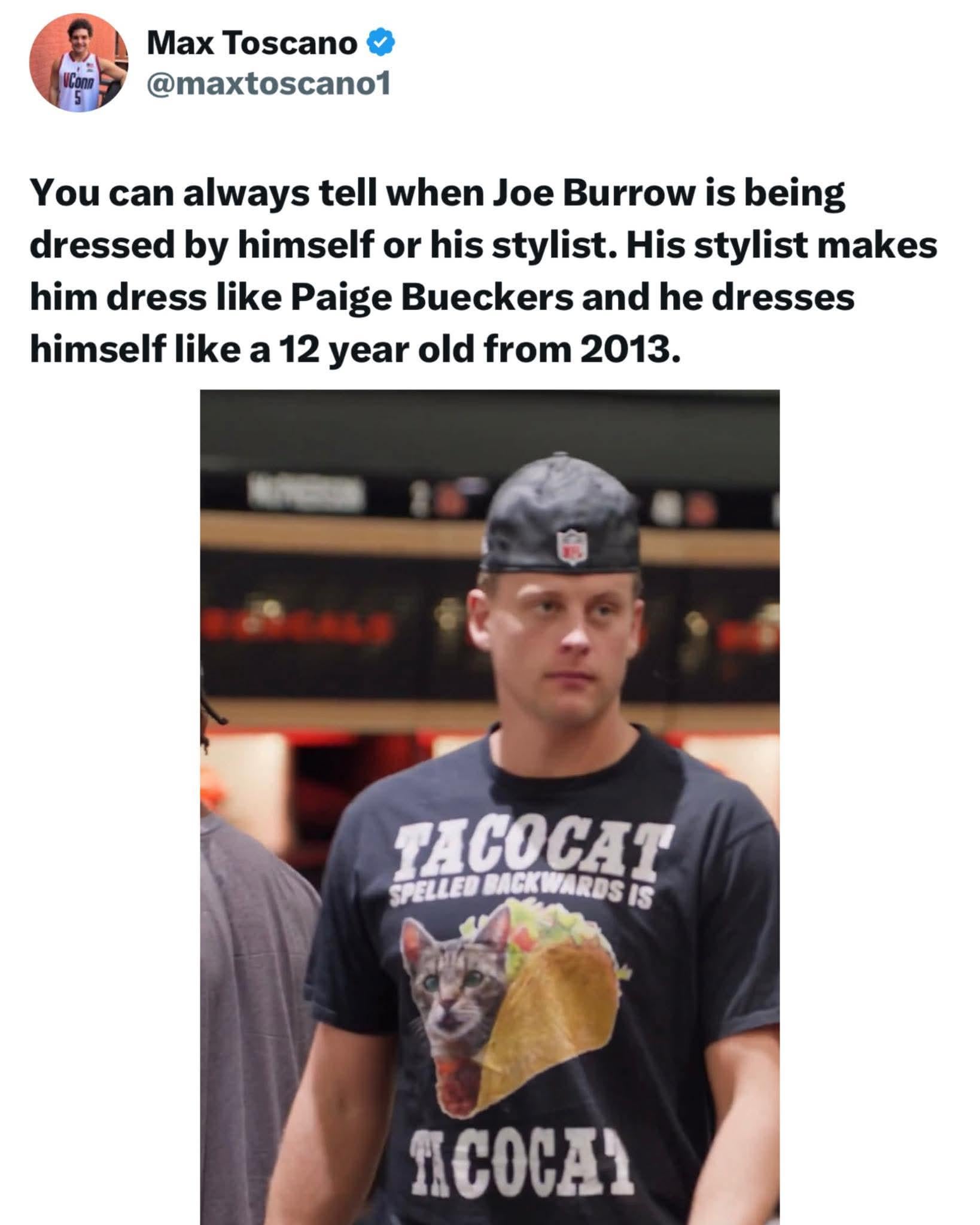 I still have a shirt I rock that has SpongeBob and Patrick riding on a cat through a galaxy. It was a $10 shirt at Walmart and somehow has held up 13 years later. Joe Burrow would wear a shirt like [this](https://share.google/bxdUjzL9hsb4LAAaR)