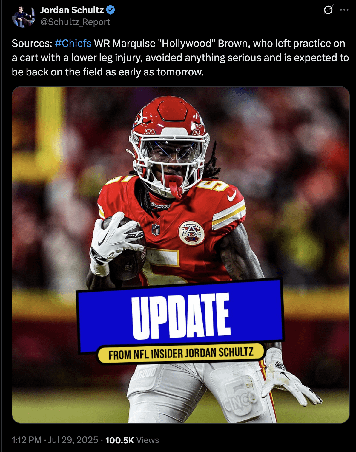 [Schultz] Sources: Chiefs WR Marquise “Hollywood” Brown, who left practice on a cart with a lower leg injury, avoided anything serious and is expected to be back on the field as early as tomorrow.