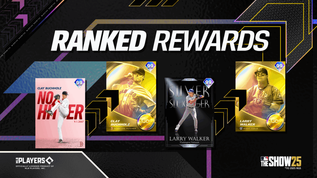 Compete against online opponents in Solo (1 vs 1) or Co-Op (2 vs 2 & 3 vs 3) with your best squad in Ranked Rating 6. Climb the leaderboards to earn division rewards and increase league placement to unlock rewards like Stubs and packs, as well as the World Series Choice Pack and choose between Milestone Series Clay Buchholz (99 OVR) or Awards Series Larry Walker (99 OVR). Ascend to G.O.A.T. 1000 status in the Ranked Ratings to get your mitts on the coveted Ranked 1000 Choice Pack featuring exclusive Ranked 1000 Series Clay Buchholz (99 OVR) and Larry Walker (99 OVR).