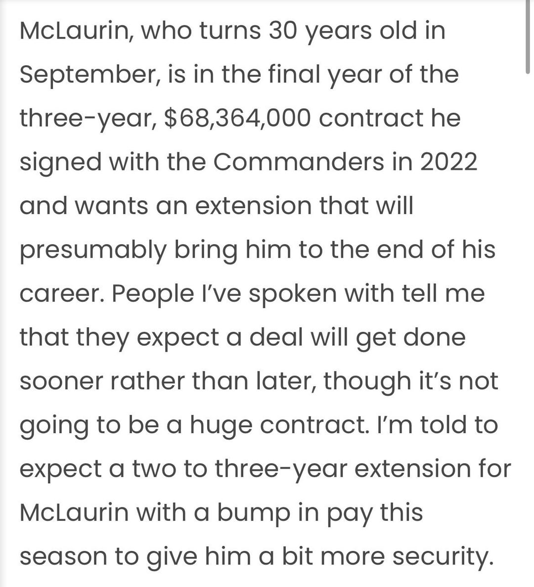 It’s happy hour somewhere so take a shot for a Terry thread. Report says McLaurin extension could come sooner rather than later. Expected to be 2 to 3 years and not a huge contract. Screenshots included because the site is full of ads that make the website annoying. (Link in comments)