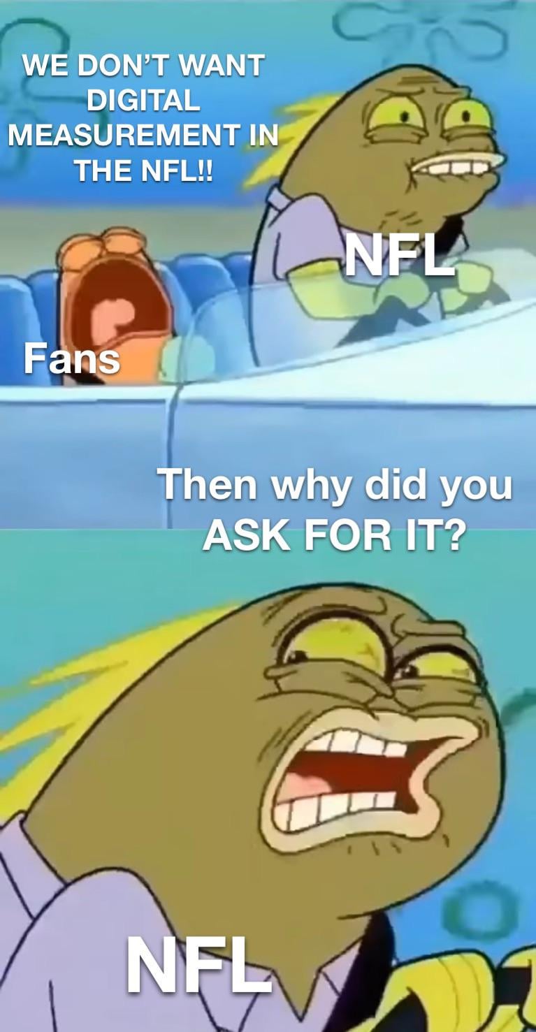 4. It’s mostly frustrating that it’s digital measurements for if it’s a first down, not where the ball is placed. I couldn’t care less about if it’s a first down being measured by the computer, I want accurate ball placement through trackers not a 50 year old dude from 100 feet away eyeballing it.
