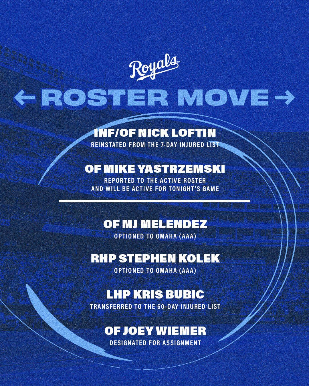 [Royals] Mike Yastrzemski & Nick Loftin have been added to the active roster, Kris Bubic has been placed on the 60-day IL, Stephen Kolek and MJ Melendez have been optioned to Triple-A Omaha, and Joey Wiemer has been DFA’d.