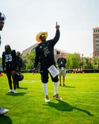 Colorado coach Deion Sanders during a recent preseason practice in Boulder. (Courtesy of Derek Markel, Colorado Athletics)