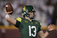 Baylor quarterback Sawyer Robertson throws a pass during the second half of an NCAA college football game against Iowa State, Saturday, Oct. 5, 2024, in Ames, Iowa. Iowa State won 43-21. (AP Photo/Charlie Neibergall)