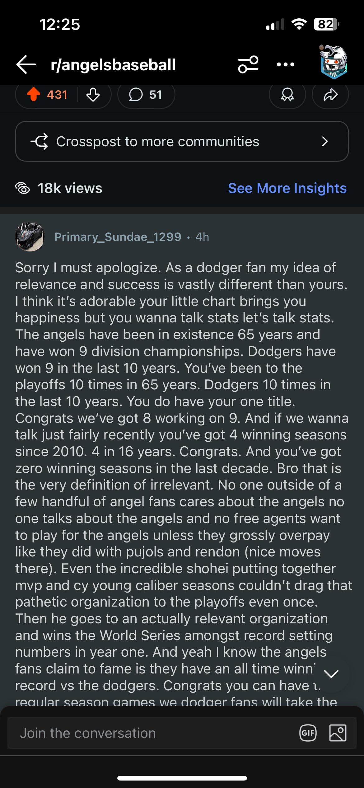 I’m 38 with two small kids and I will tell you that sports fandom is fun but people who turn it into their sole identity are lame. Doesn’t matter who they root for, they’re going for a reaction, just ignore the troll. We have bigger things to worry about as Angels fans.