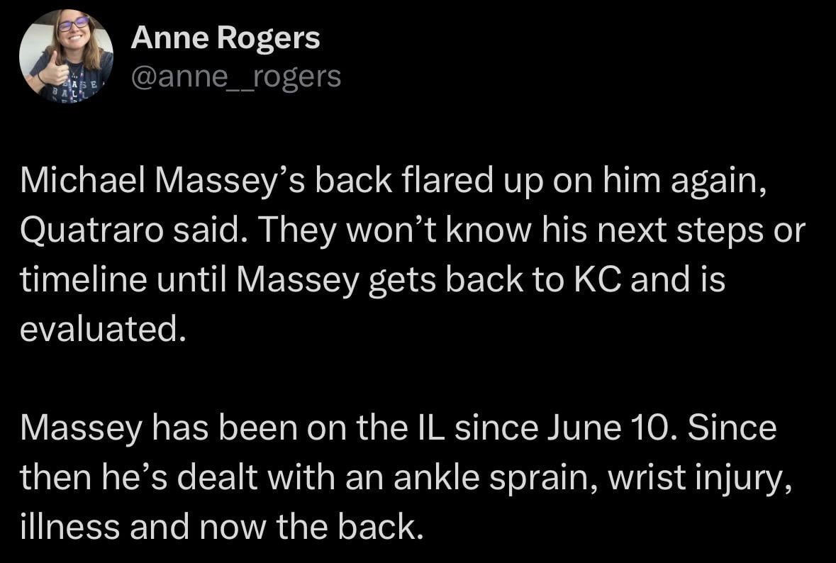 [Anne Rogers] Michael Massey’s back flared up on him again, Quatraro said. They won’t know his next steps or timeline until Massey gets back to KC and is evaluated.