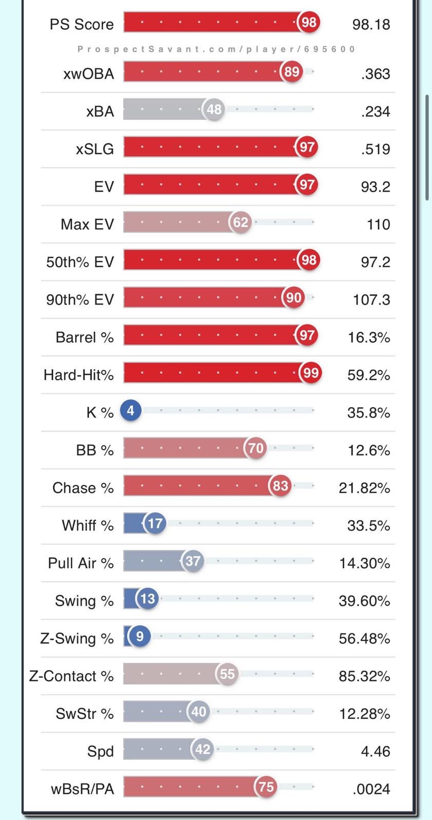 If he could only bring that chase rate and walk rate down into the blue end of things then he looks like he would be the heir apparent to Captain Salvy.