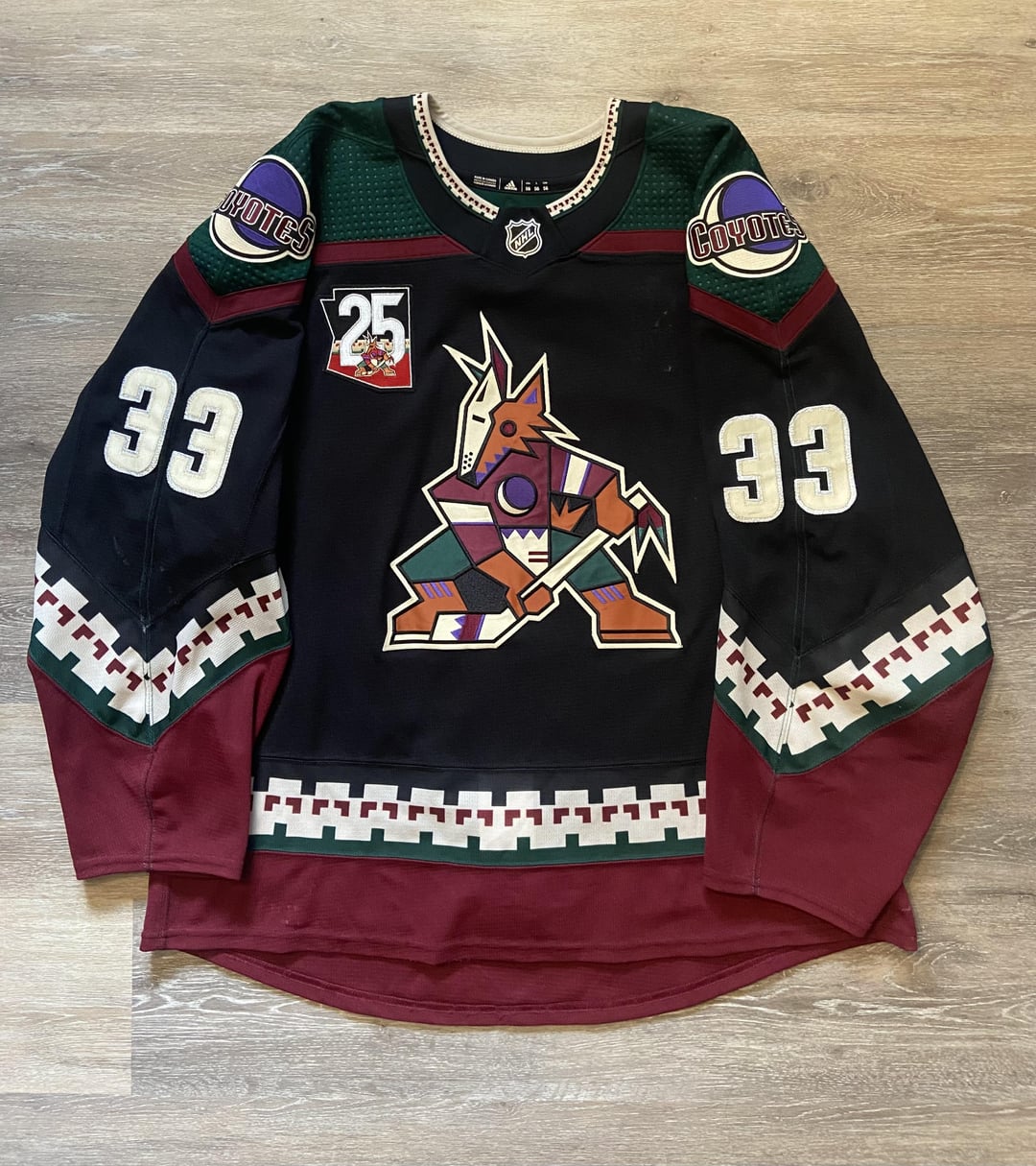 Love the patch. Goligoski wore the “A” for some games this season and on this jersey the residue from the “A” is still visible. The equipment manager removed it on this jersey. Note the myriad of mistakes on the coyote compared to the OG one. The easiest one to spot is one of the skates is orange while the other is beige. Also the special silver outlined numbers that were only used this season are a fun addition. Additional kachina photo posted for kachina coyote comparison.
