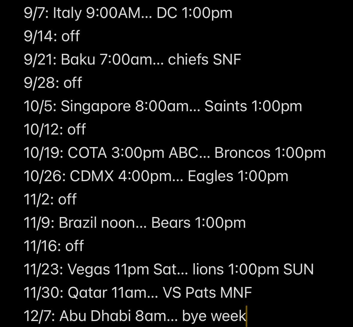 For any F1 fans who also watch all the Giants games, see above potential conflicts. Fun Sundays from sunrise to sunset: 9/7, 9/21, 10/5, 10/26. Says with some overlapping conflicts: 10/19, 11/9. Leave a ReplyYou must be logged in to post a comment.