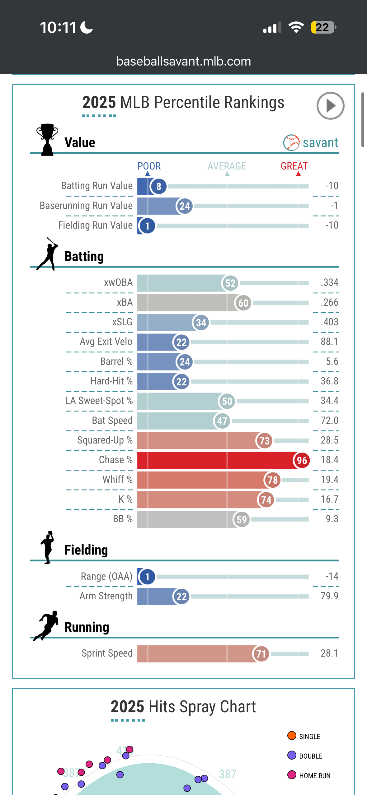 We all know how bad he’s been this year at all aspect of the game and I don’t see it changing much next year he’s a GABP merchant in 24 .849 OPS there .660 OPS away and the rest of his career is in line with so is this is just him without a GABP a terrible hitter baserunner and fielder probably and making 7 mil in arb this year doesn’t help either
