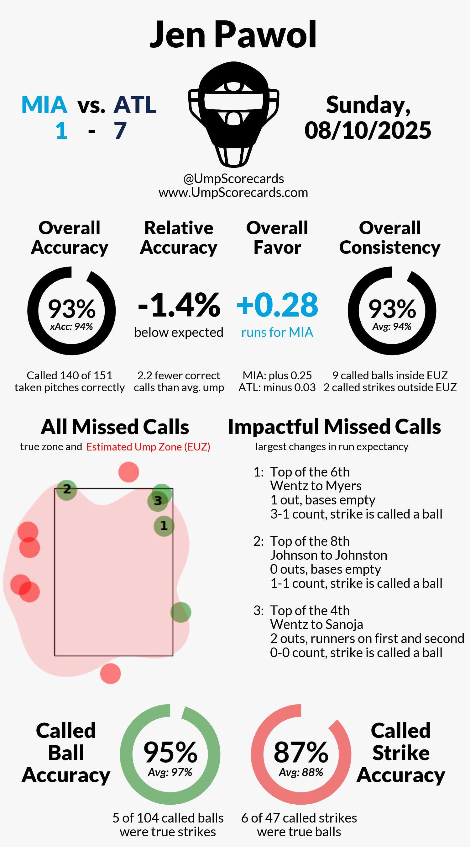 Jen Pawol’s Ump Scorecard for this past Sunday. Ranked 13/15 for the day source: @UmpScorecards on X