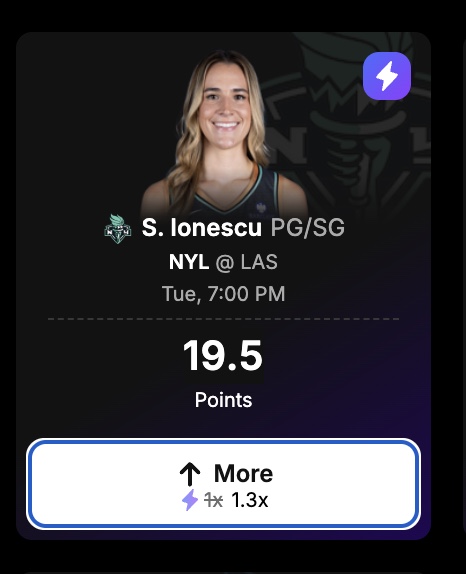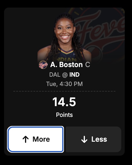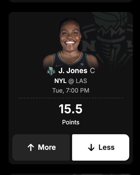 Create a Pick Set for WNBA Pick6 by choosing 2+ players from the same sport and Pick Group (a set of picks available from a group of set competitions). For each player, simply select if you think they’ll have more or less than their listed stat projection. In each Pick Set, you can not pick the same player twice, and you must pick players from at least two different teams.