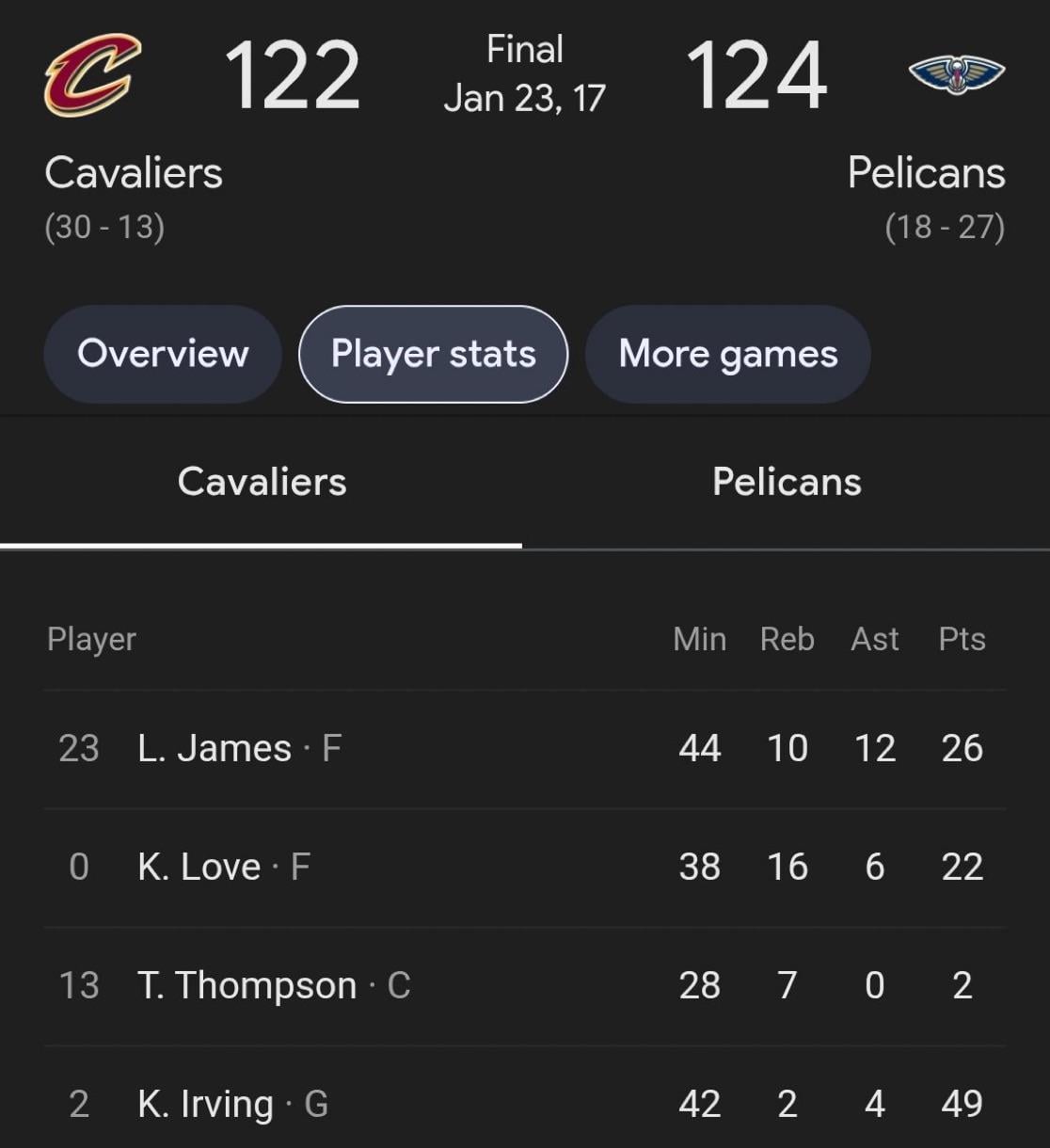 I want you to try and guess who was the leading scorer for the Pelicans 8 comments Terrence Jones or Jrue I think! I was at this game with my dad, one of my best pelicans memories Jrue T Jones!!! 36 points and blocked LeBron at the rim. Shame we waived him the next week Ryan Anderson killed the cavs during that period Edit: im a few years off Kyrie popped off that game damn. Too bad they still lost lol The Terrence Jones game. One of the most fun games I’ve been to in person. Other comments may have gotten it already but my initial guess was Willie Green This is the August basketball content I need. Leave a ReplyYou must be logged in to post a comment.