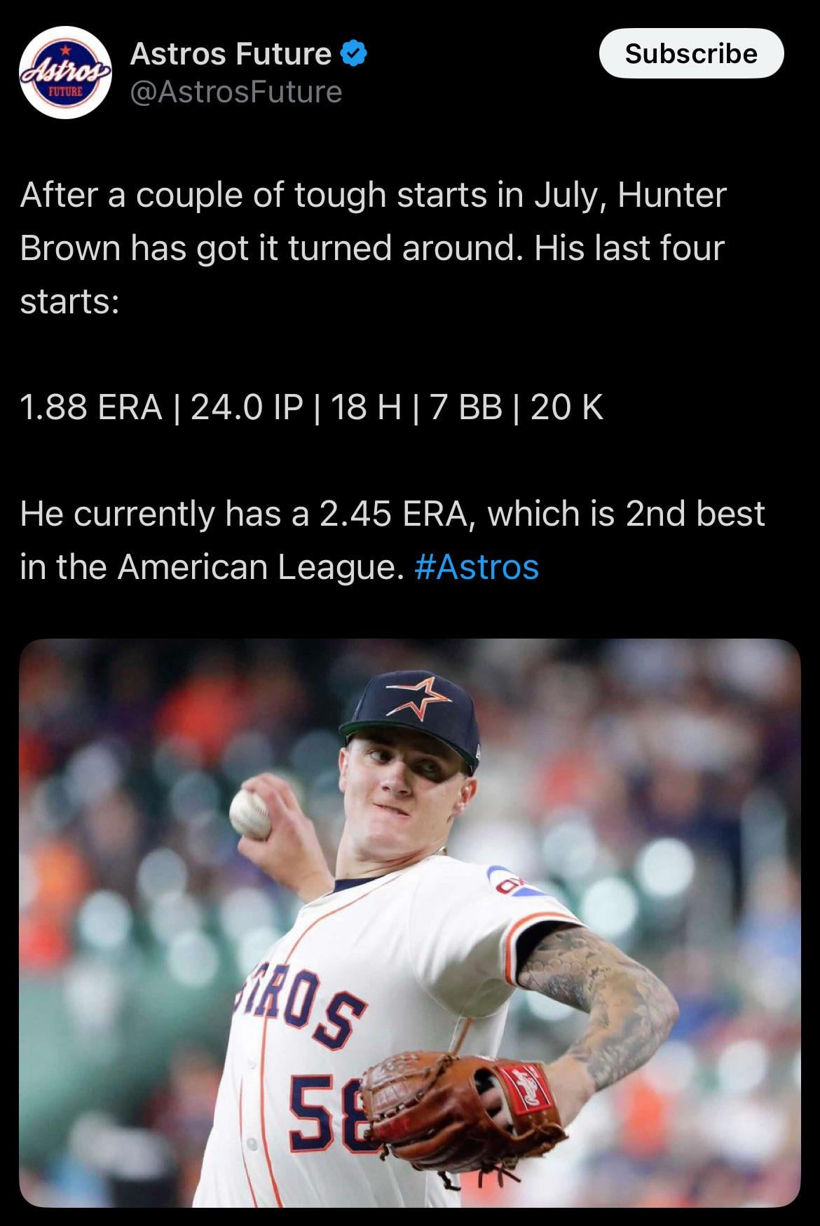 He’s still young and young in his career, has room for improvement (control) and mastering other pitches, and is in contention for Cy Young. He sometimes takes a beating in the beginning but makes proper adjustments. I think he’s great and getting locked in. Ain’t no reason to doom over Hunter. And Okert, Abreu, and Sousa have shown bullpen resilience as of late.