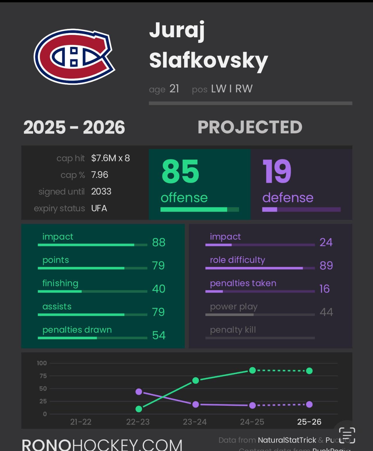 Juraj Slafkovský Analytics how many points for Slaf going into Year 4?